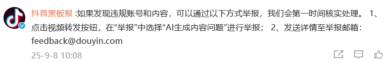 随后,抖音黑板报转发响应:如果发现违规账号和内容,可以通过以下方式举报,我们会第一时间核实处理。1、点击视频转发按钮,在“举报”中选择“AI生成内容问题”进行举报;2、发送详情至举报邮箱:feedback@douyin.com。