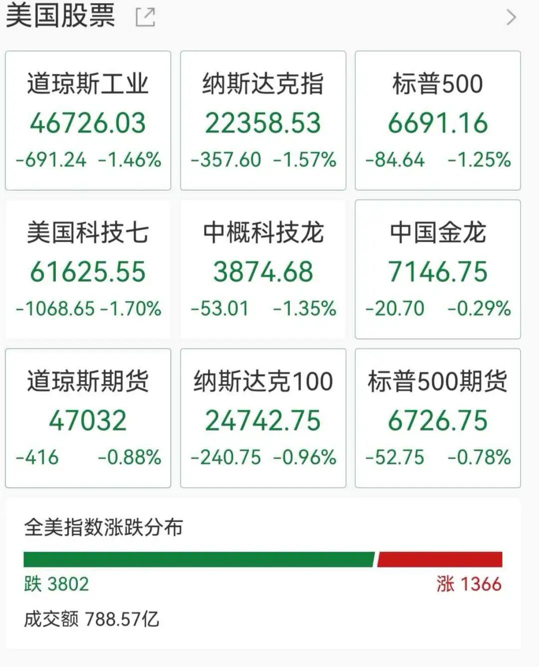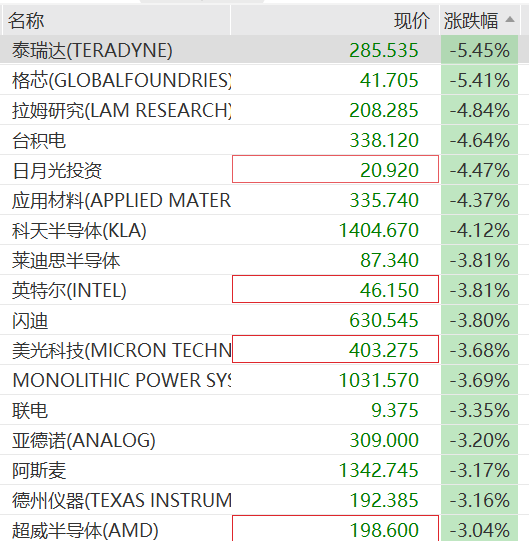 芯片股集体下挫,泰瑞达、格芯跌超5%,拉姆研究、台积电、应用材料、英特尔跌超4%,闪迪、美光科技跌超3%。