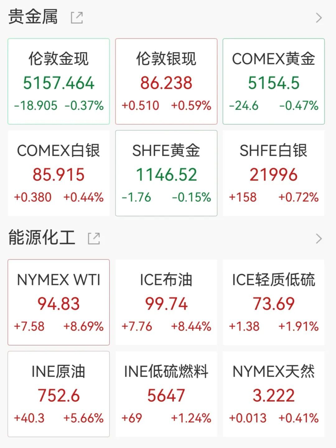 贵金属方面,黄金白银涨跌不一,现货黄金在伊朗新任最高领袖声明公布后短线跌幅一度扩大至25美元,现报5157.4美元/盎司。现货白银涨0.59%报86.23美元/盎司。