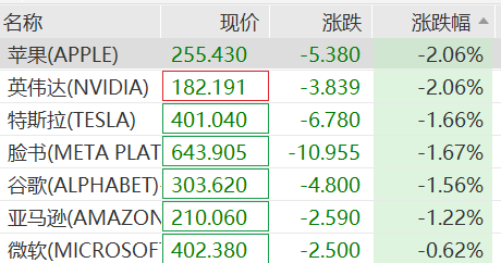大型科技股普跌,万得美股科技七巨头指数跌1.53%,苹果、英伟达跌超2%,特斯拉、脸书、谷歌跌超1.5%。