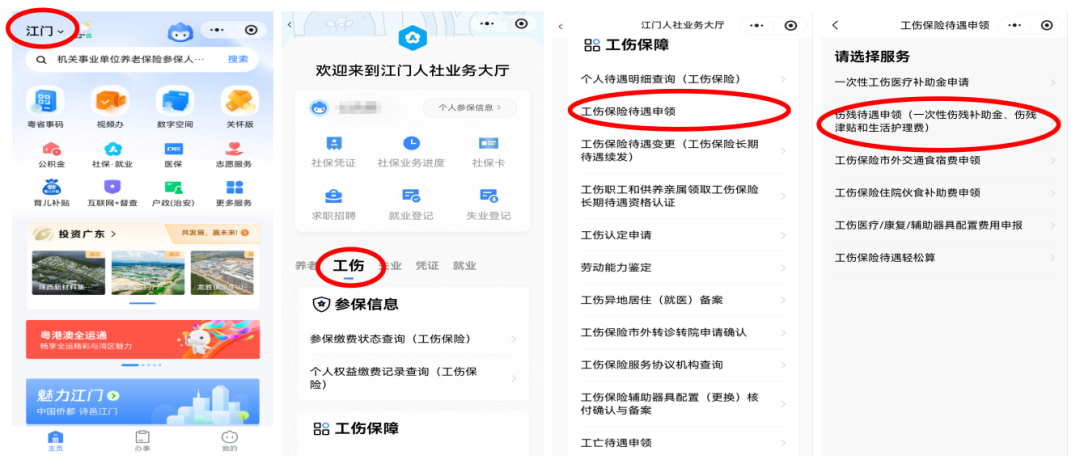 打开手机微信,搜索“粤省事”小程序,登录后选择办事城市为【江门】,点击【社保.就业】进入社保业务大厅,选择【工伤保险待遇申领】-【伤残待遇申领】,再按指引填写申领信息和上传资料即可进行线上申请。