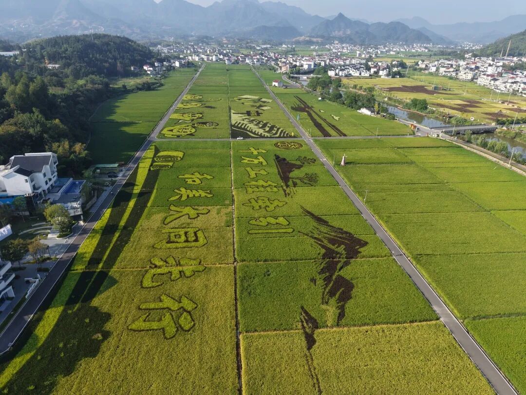 巨大的田园画卷展现出“千万工程”在乡村建设中的生动实践,图为建德大同稻香小镇稻田。图源:潮新闻客户端