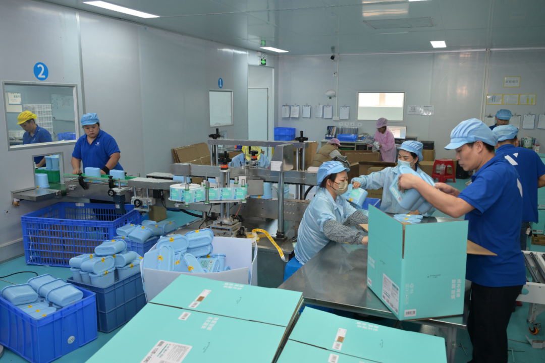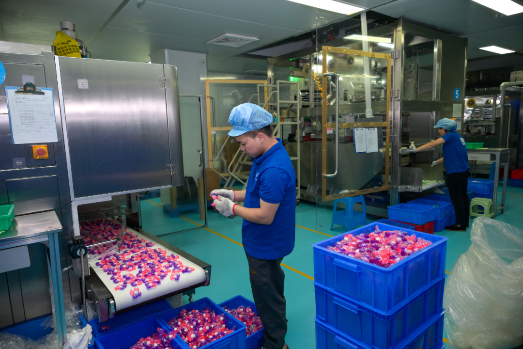 走进万缘实业位于石楼镇的厂房,只见工人们正有条不紊地将不同类型的洗衣凝珠装盒。“目前,我们月度交付凝珠产品超过150万盒(袋),年度交付量更是超过2000万盒(袋),已成为中国洗衣凝珠行业的领军者。”郭一根说道。