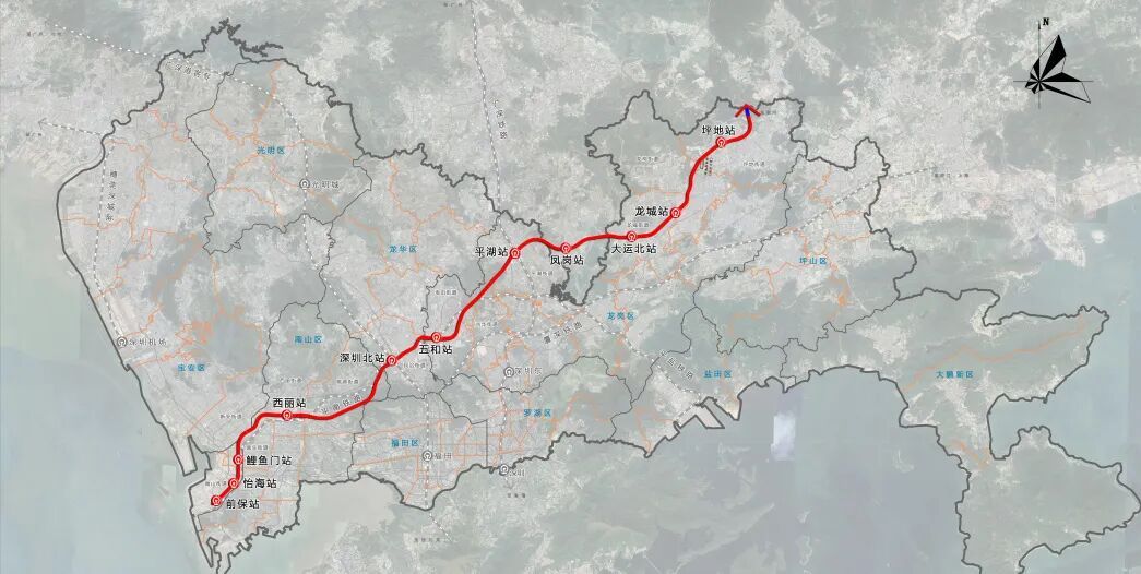 线路设计时速160km,全线设地下站11座,分别为前保站、怡海站、鲤鱼门站、西丽站、深圳北站、五和站、平湖站、凤岗站、大运北站、龙城站、坪地站。