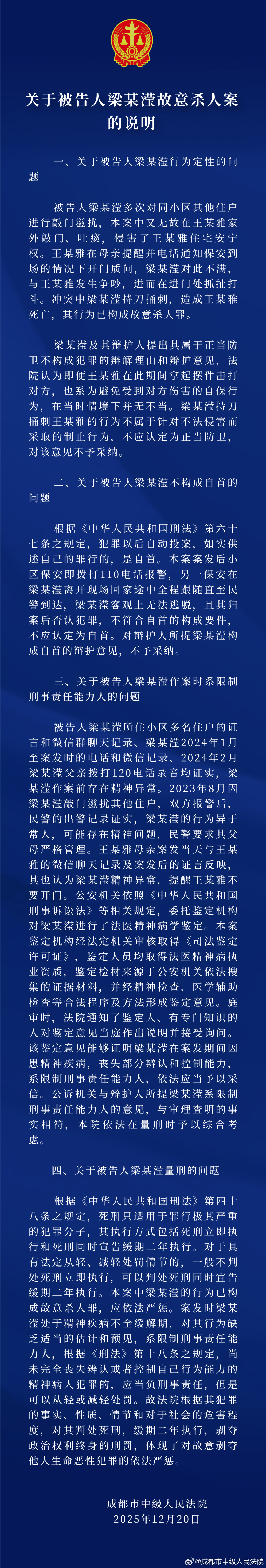 成都市中级人民法院发布关于被告人梁某滢故意杀人案的说明 。