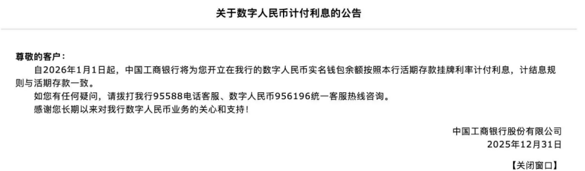 12月31日,工商银行、农业银行、中国银行、建设银行、交通银行、邮储银行六大国有银行同时公告,自2026年1月1日起,客户开立的数字人民币实名钱包中的余额将按活期存款计息。据官网公示,当前六大国有行活期存款挂牌利率均为0.05%。