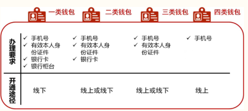 值得注意的是,根据个人申请开立数字人民币钱包时身份实名程度不同,目前数字人民币钱包分成一至四类,实名程度依次降低。其中,一至三类为实名钱包,个人开立时需验证手机号、本人身份证等信息,而四类为匿名钱包,个人开立时仅需验证手机号。同时,四种不同类型数字人民币钱包设有不同的消费、转账和账户余额,一类钱包账户余额不设上限,二至四类钱包余额上限分别为50万元、2万元、1万元。