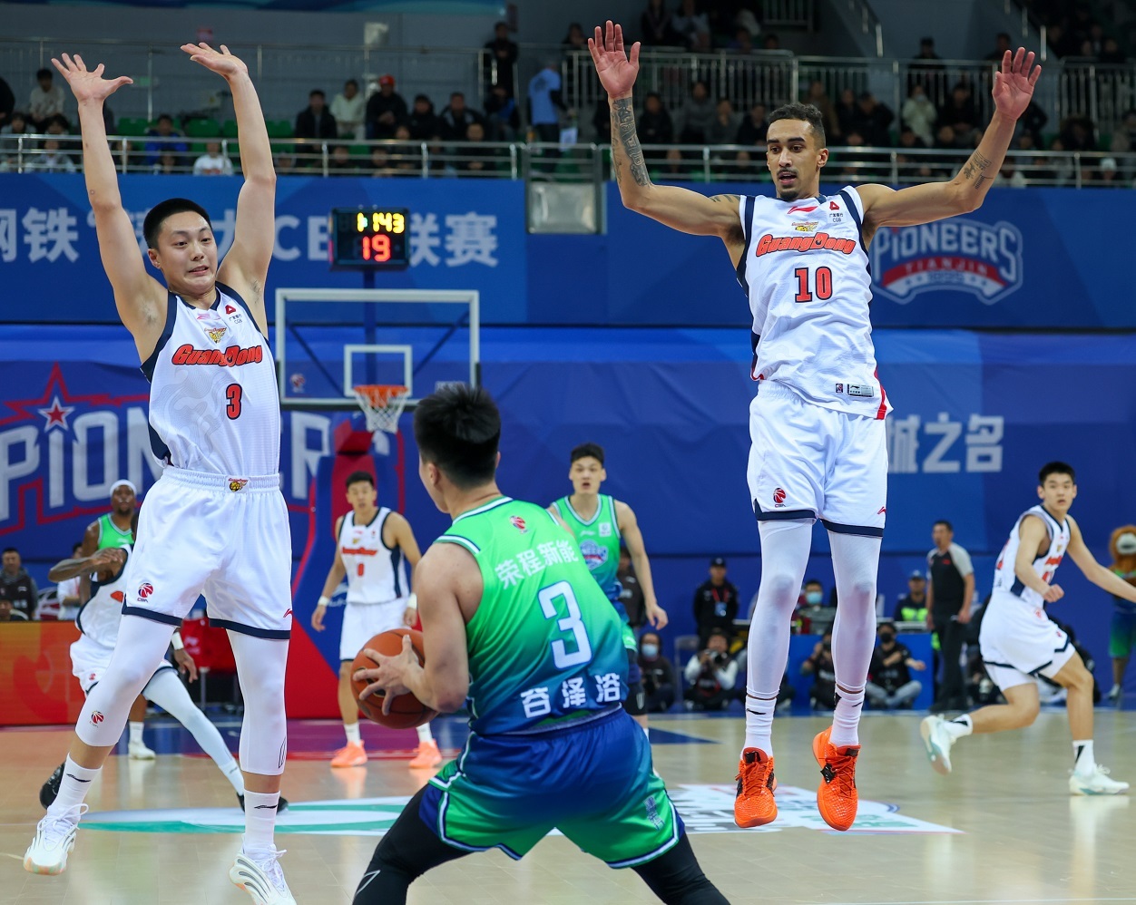2025年12月30日,广东东阳光队球员胡明轩(左)与奎因(右二)拦防天津先行者队球员谷泽浴。
