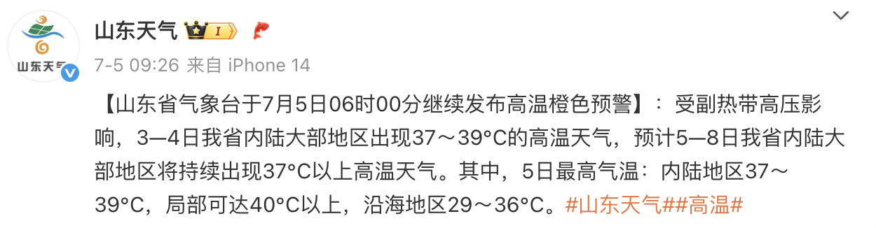 山东气象部门近日发布的高温预警。
