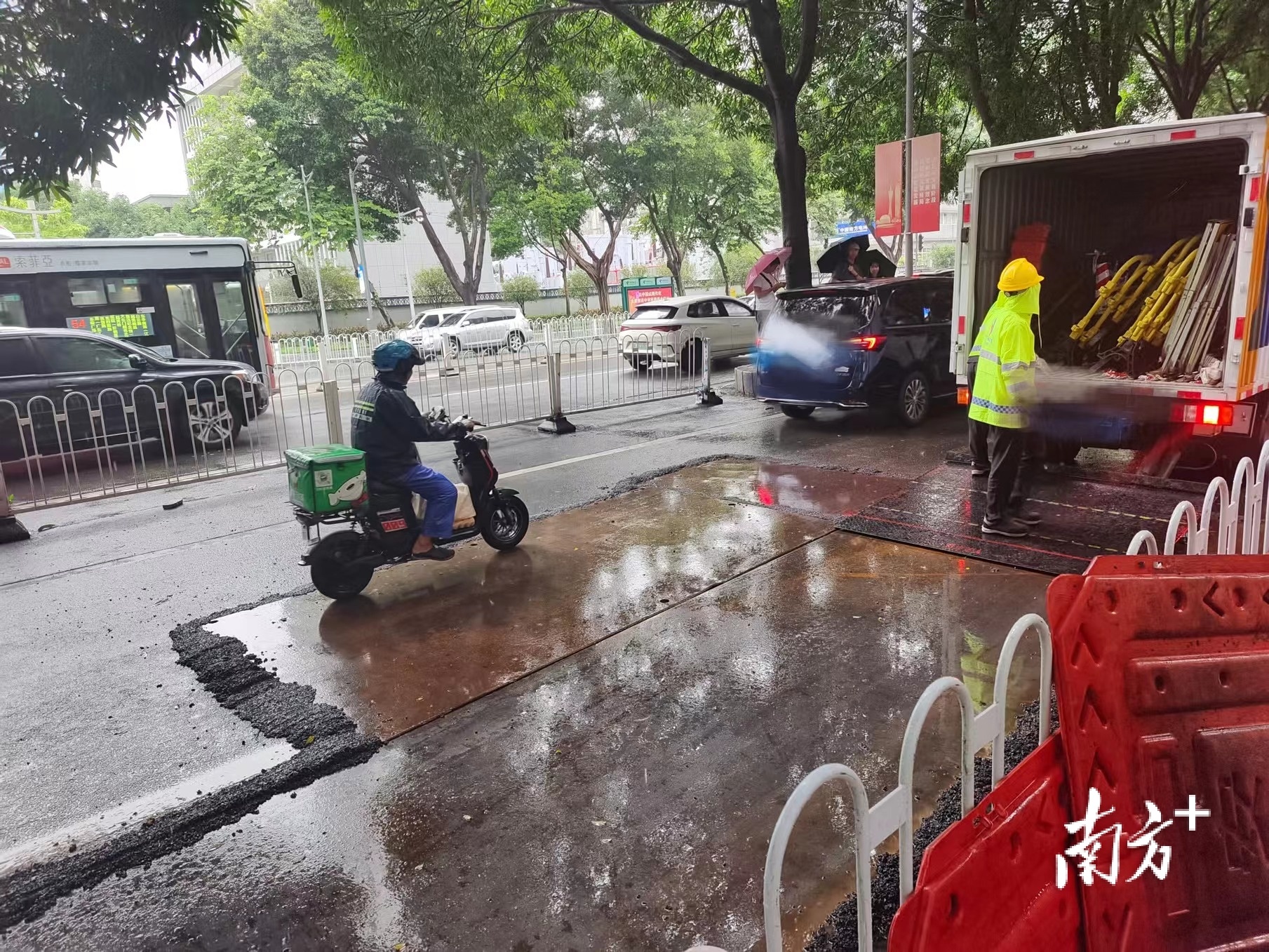 现场施工人员告诉南方+记者,已经把地面上的洞填补完成,“洞口和井盖大小差不多,现在是在修补沥青。地下的水泥层还没有干,先用土保护好下边的沥青,等沥青固化凝固后才可以通车”。