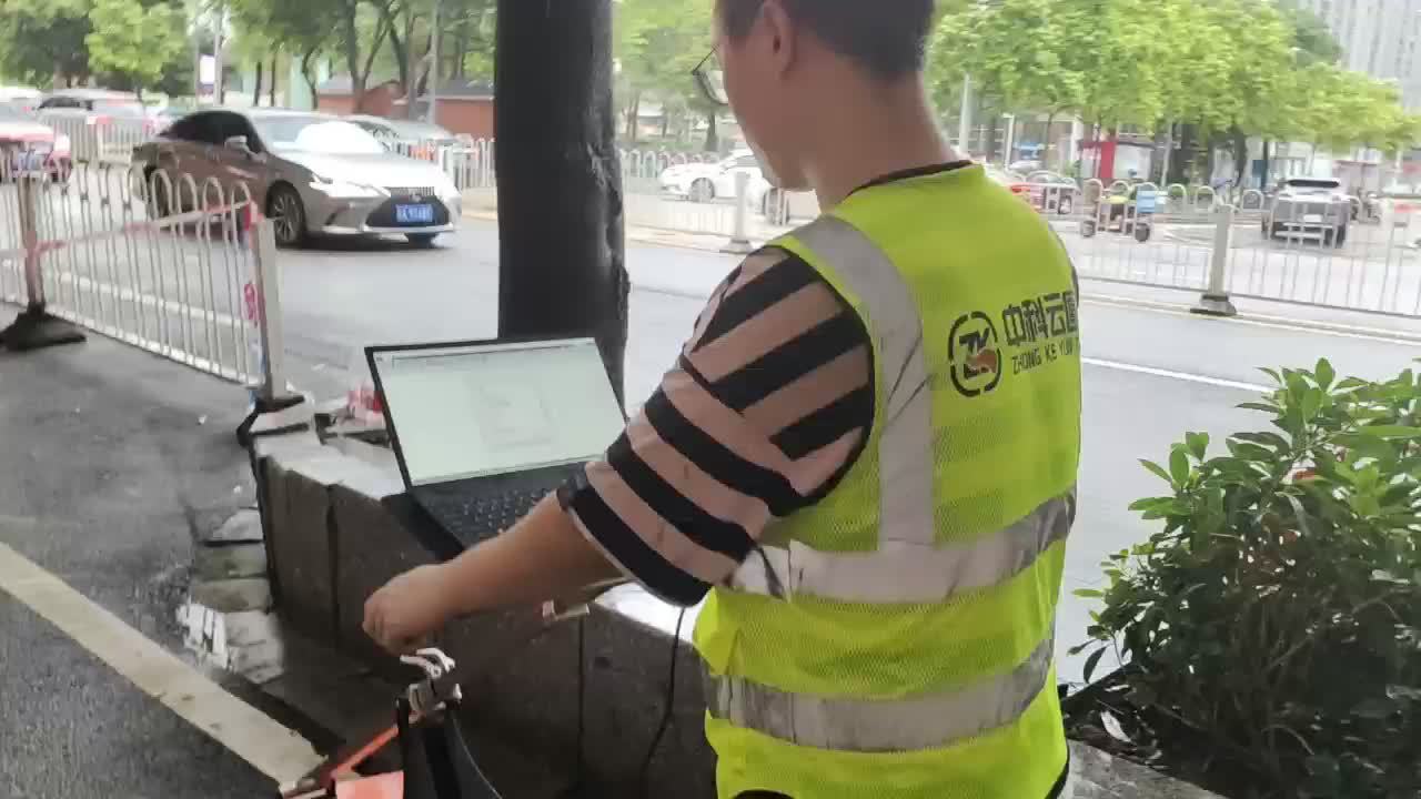 检测人员在现场用机器检测塌陷周围的情况与塌陷原因