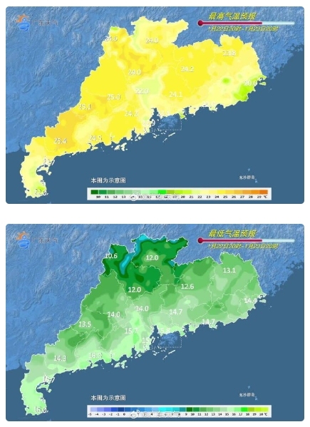 23日,南部沿海市县多云,其中珠江口及以东市县有小雨,其余市县晴到多云为主,中南部市县、琼州海峡、北部湾海面早晚有轻雾。最低气温:粤北大部分市县8℃~12℃,南部沿海市县15℃~18℃,其余市县12℃~15℃。