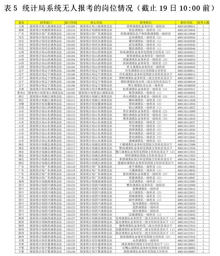 统计局系统中,宁夏招录11个岗位,计划招录13人,报名人数有1563人,产生了本次国考首个岗位竞争比破千的岗位。目前报名人数最少的省市是天津,计划招录7个岗位、计划招录9人、待审核23、已审核130、报名人数共计153、最大竞争比仅为38比1。