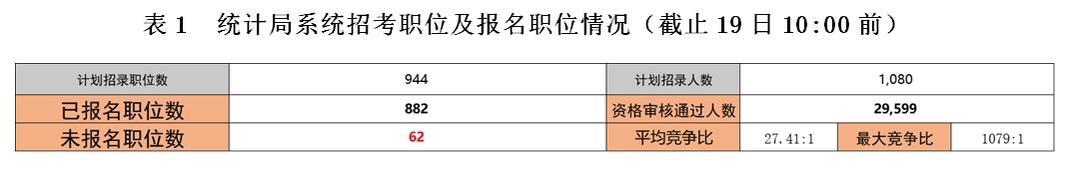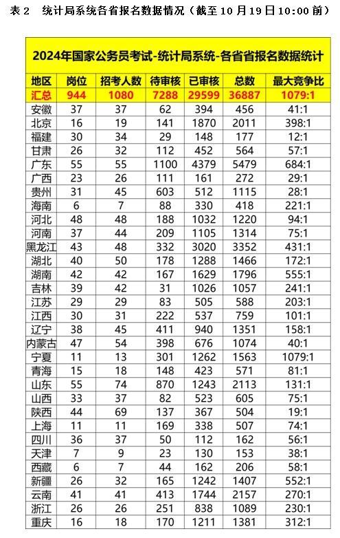 2024年国考报名第五天已经结束,截至19日上午10时,全国首个竞争比破千的岗位出现在统计局系统(宁夏,1079:1),成为目前所有系统中最高竞争比。在该系统各省报名数据统计中,广东的报名人数最多,达到5479人。今年统计局总招录职位数和招录人数与2023年相比均有大幅度上升,2024年计划招录职位数944个,计划招录1080人。目前,该系统资格审核通过人数高达29599人,已经报名的职位有882个,占总招录职位的93.4%,还有62个职位未被报名。