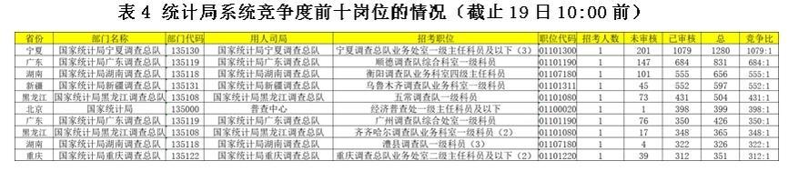 分析具体岗位数据发现,目前“国家统计局宁夏调查总队”的“宁夏调查总队业务处室一级主任科员及以下(3)”报名人数最多,仅招录1人的情况下,有1280人报名,还有201个未审核,竞争比破千,高达1079:1;其次是“国家统计局广东调查总队”的“顺德调查队综合科室一级科员”招录人数为1人,报名人数为831人,报名人数相比第一名差距近500人;再就是“国家统计局湖南调查总队”的“衡阳调查队业务科室四级主任科员”招录人数也为1人,有555人报名。