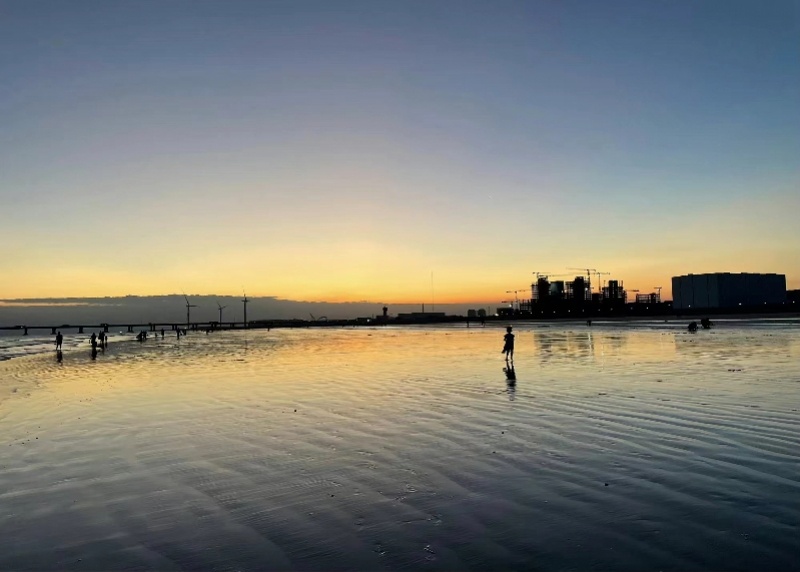 从网上的“打卡”帖来看,游客们基本都是奔着“看日出日落”和“抓螃蟹”来的。有网友分享了自己在海滩上拍摄的日落照,称其“有种旧工业时代的辽阔感”。照片里的天空被余晖染成橙红色,倒映在海面上,波光粼粼。在大海对岸,高楼林立,还有几台高耸的脚手架。