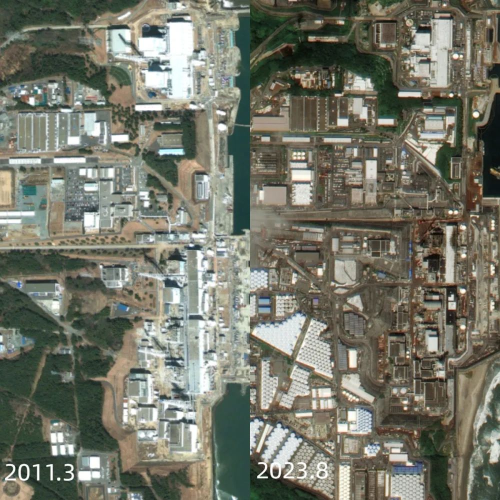 福岛第一核电站卫星影像对比图,从对比中可以明显看到,2011年3月11日的地震后,日方在厂区内修建了密密麻麻的圆形核污染水储水罐。图源:新华社