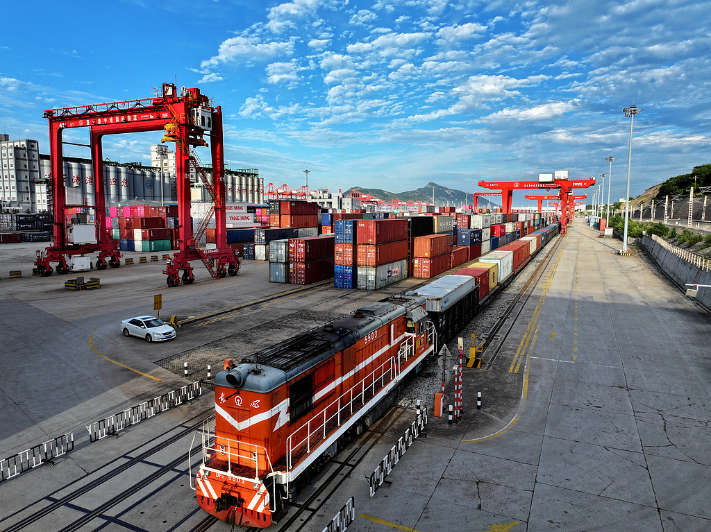2024年9月23日,在中哈(连云港)物流合作基地,中欧班列满载集装箱准备发车。视觉中国 资料图