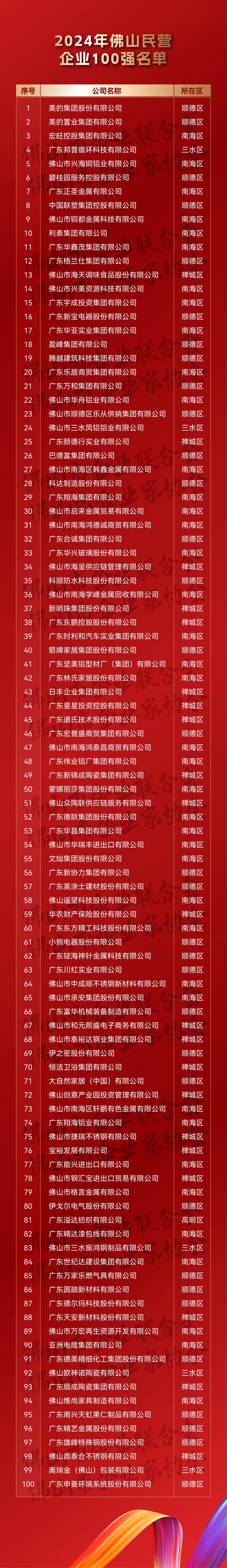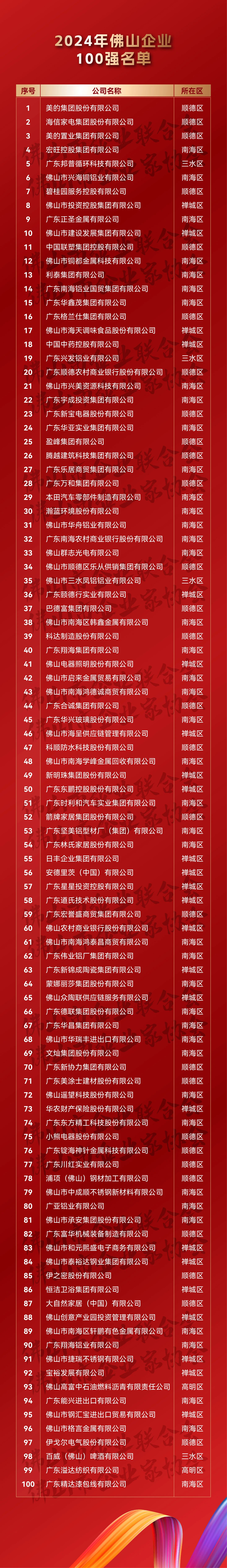10月26日,在佛山市企业联合会、佛山市企业家协会成立40周年庆典上,2024年佛山企业100强、制造业企业100强、民营企业100强榜单正式发布。