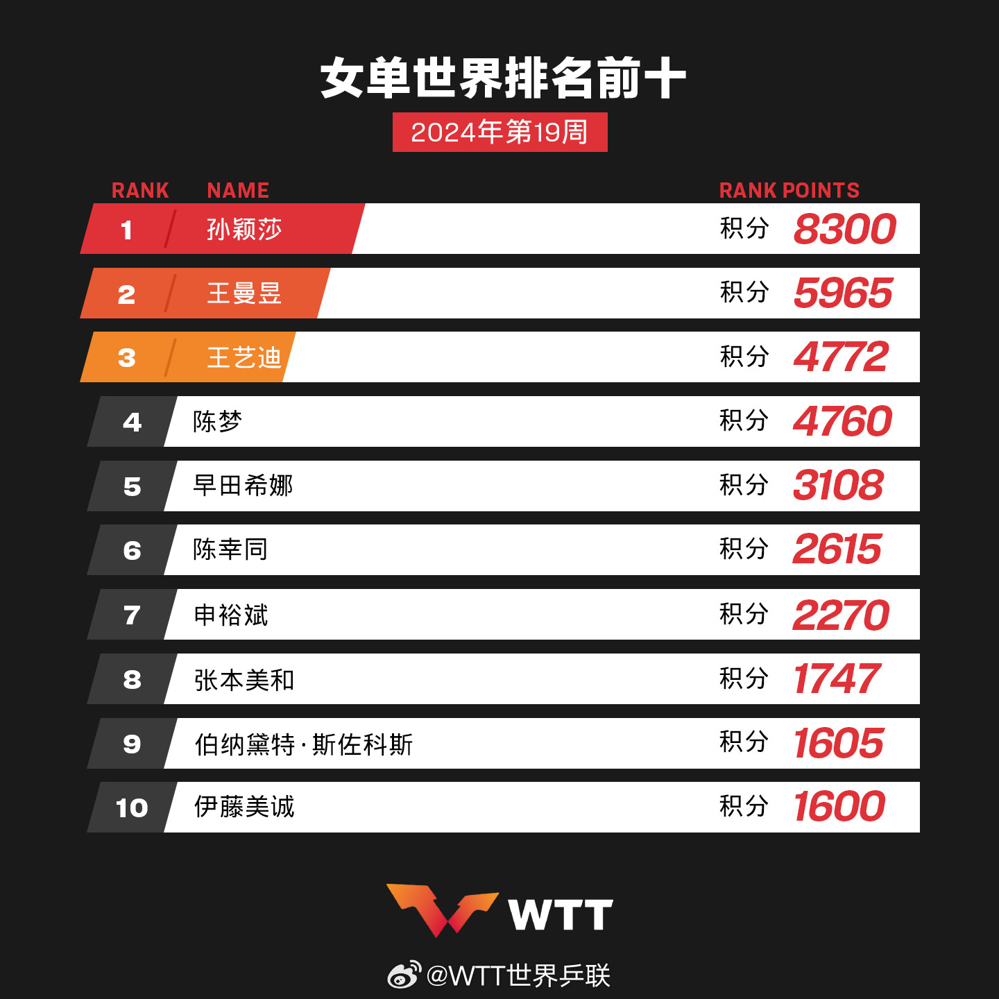 女子单打,中国队球员孙颖莎、王曼昱、王艺迪、陈梦位列前四,陈幸同位列第六。混合双打项目上,孙颖莎/王楚钦排名第一。