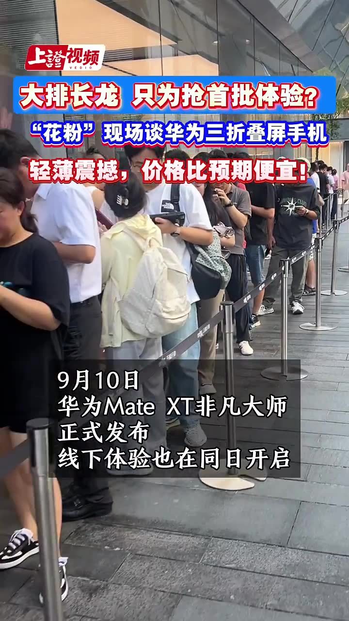9月10日下午,华为Mate XT非凡大师一经发布,在位于深圳南山区的华为旗舰店内,已有大批市民在排队等待体验这款三折叠屏手机。
