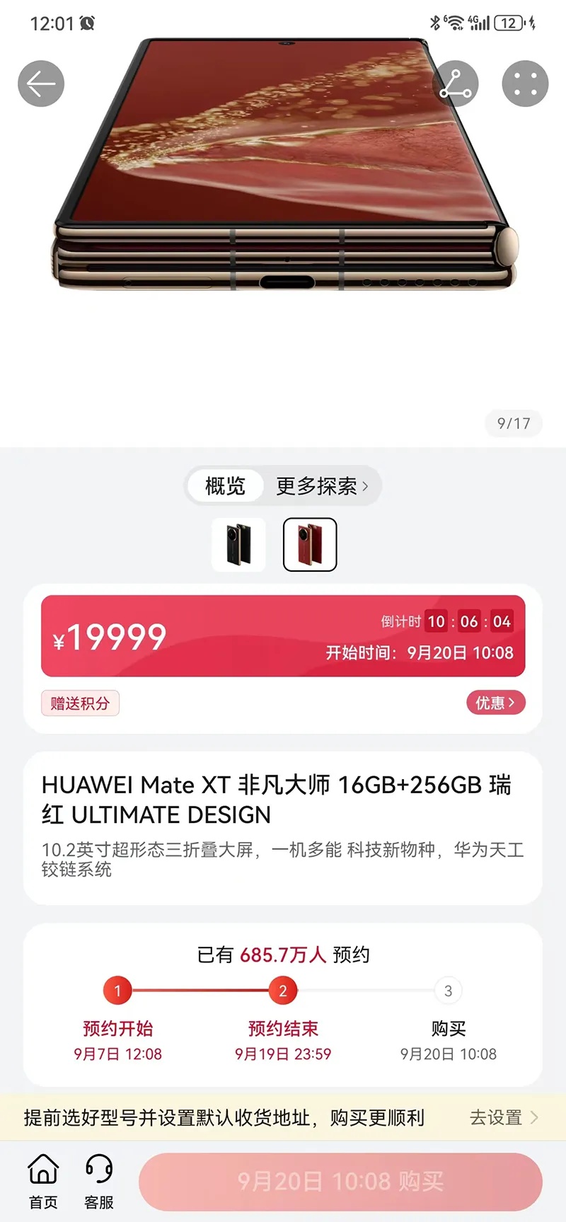 9月19日23时59分,华为商城显示,华为三折叠屏手机——华为Mate XT非凡大师预约结束,超过685万人预约。