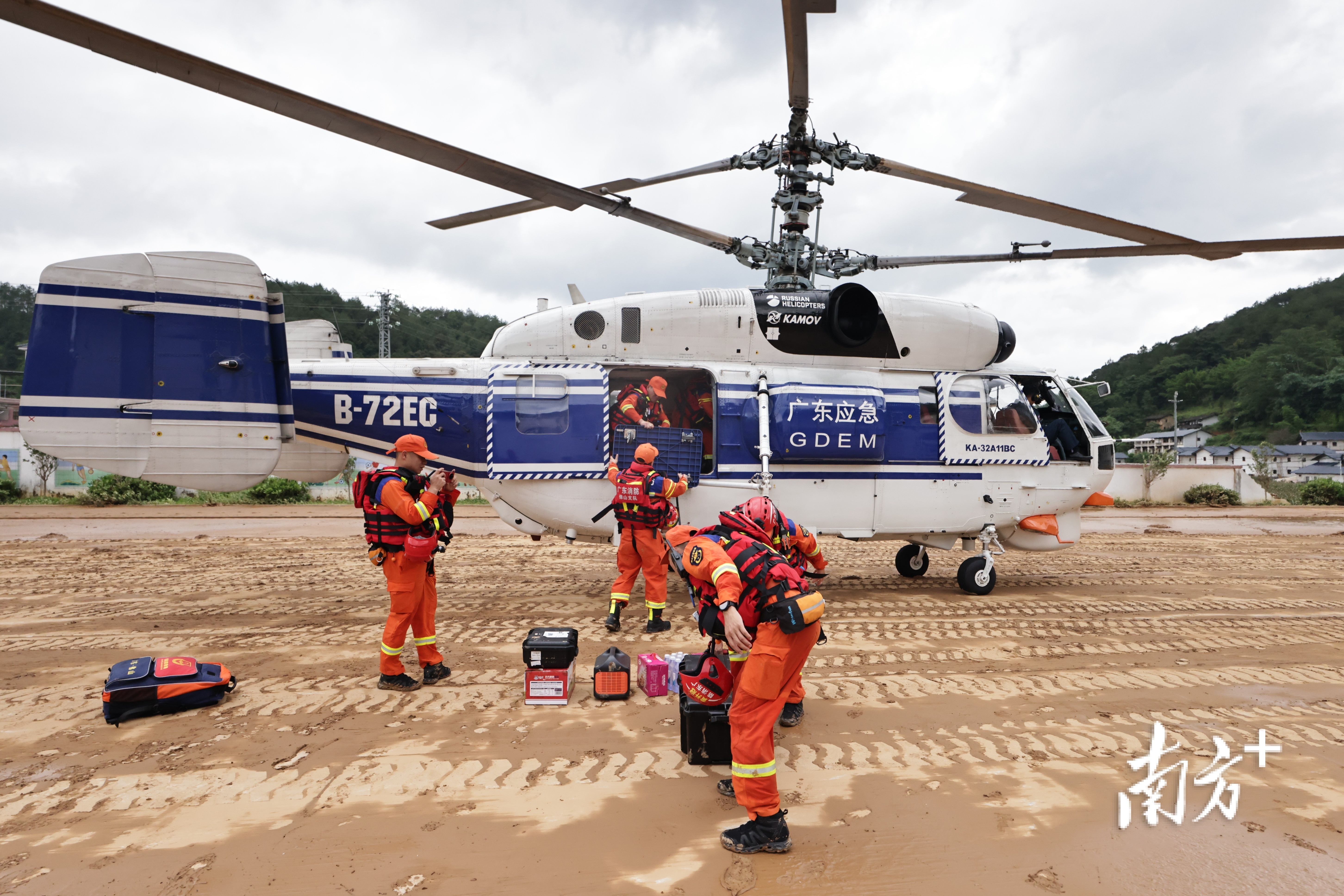 6月18日,佛山市消防救援支队乘坐直升机进入灾区开展救援。南方+记者 吴明 董天健 摄