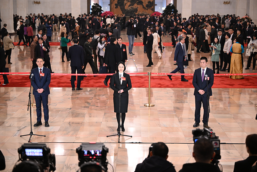 3月10日上午8时,全国政协十四届二次会议第三场“委员通道”集体采访活动于人民大会堂中央大厅北侧举行。