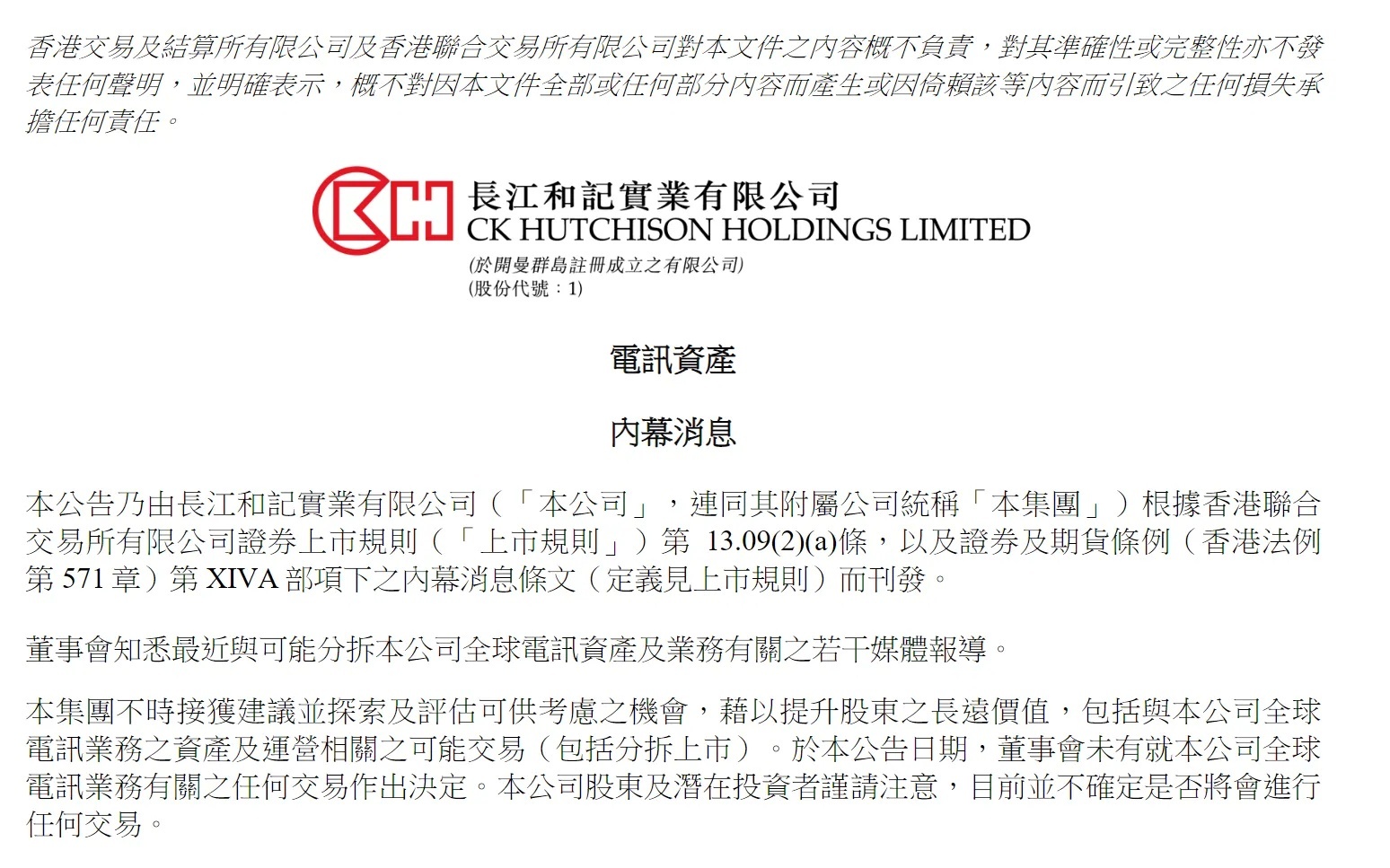 3月31日,李嘉诚旗下长江和记实业有限公司在港交所发布公告表示,董事会知悉最近与可能分拆本公司全球电讯资产及业务有关之若干媒体报道,于本公告日期(3月31日),董事会未有就本公司全球电讯业务有关之任何交易作出决定,目前并不确定是否将会进行任何交易。