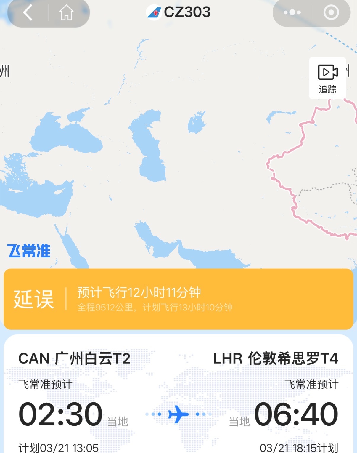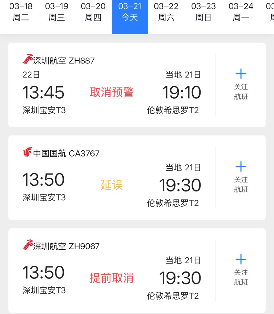 目前由上述城市直飞伦敦的多个航班显示,仍在计划、延误中。其中,深圳-希思罗ZH887取消预警(该航班取消概率较大);CA3767延误中;ZH9067已于20日凌晨4点50分提前取消;广州-希思罗CZ303则亦是延误中。