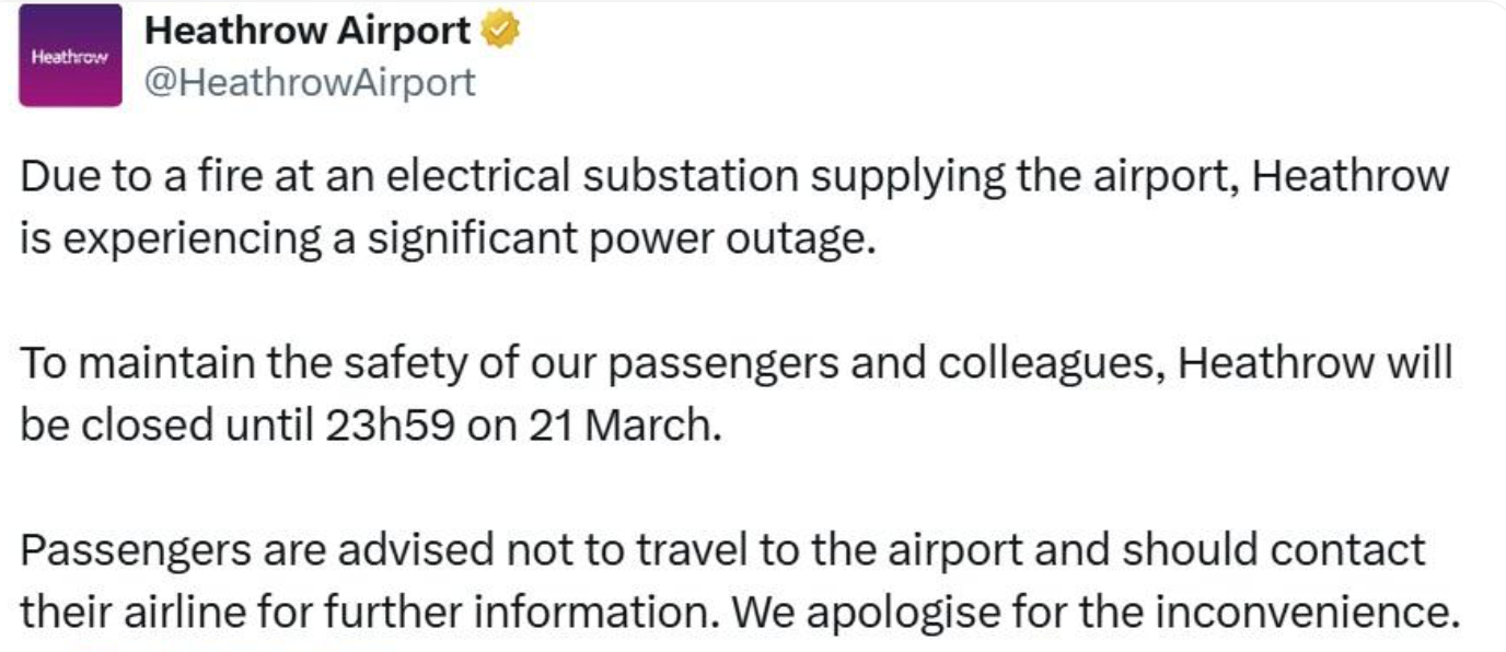 伦敦希思罗机场3月21日宣布,由于附近变电站发生大火导致电力中断,机场决定关闭至当天23时59分。