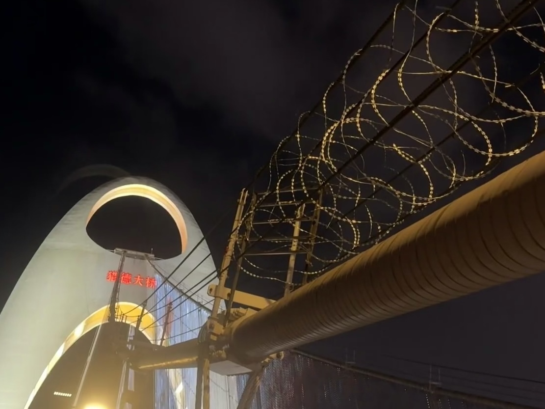 市民报料称,22日下午开始,就看到有施工人员对猎德大桥的部分缆索加装倒刺铁丝,以防再有人攀爬。现场图片显示,多个施工人员正在高空作业加装铁丝。22日晚间,铁丝已安装完毕。