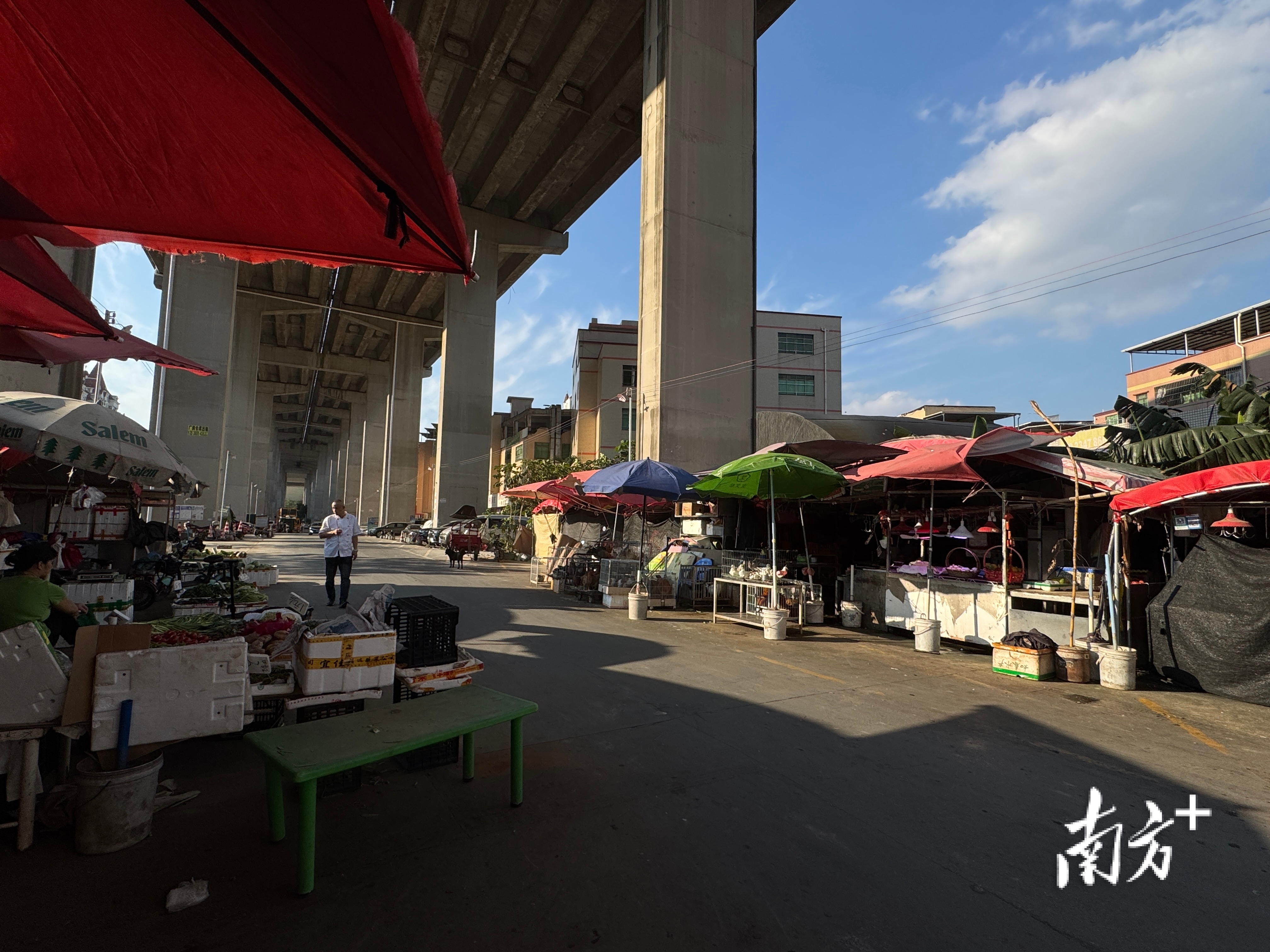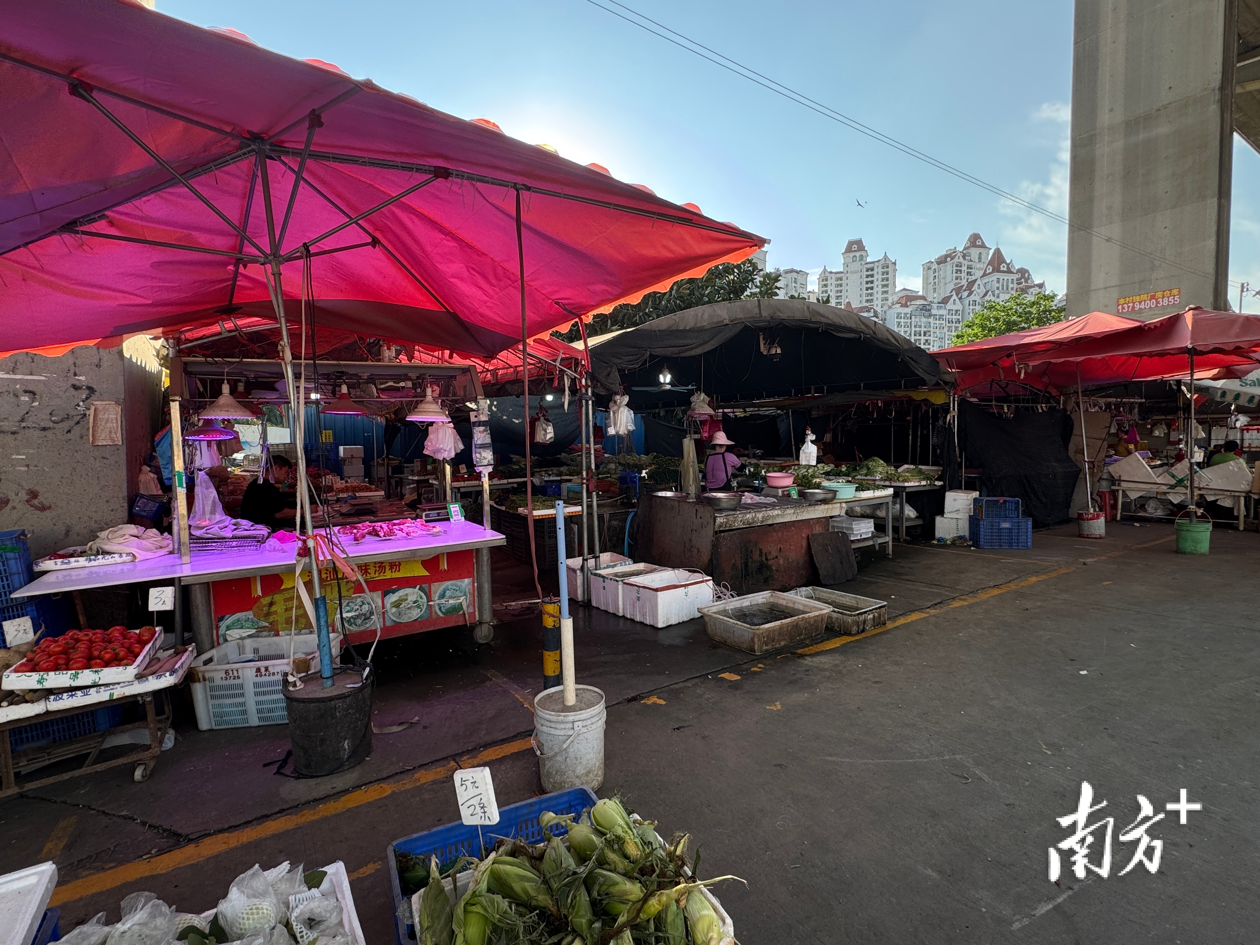 记者了解到,居民如果要买更多品种,需要步行至小区边与附近城中村靠近的菜市场,从商业街走过去约有三百米,菜市场可以买到鸡鸭鱼肉等基本的生活所需。记者在该菜市场看到,菜市场在桥下,卖家用伞临时搭起铺位,街坊表示,这算是一个临时的菜市场。
