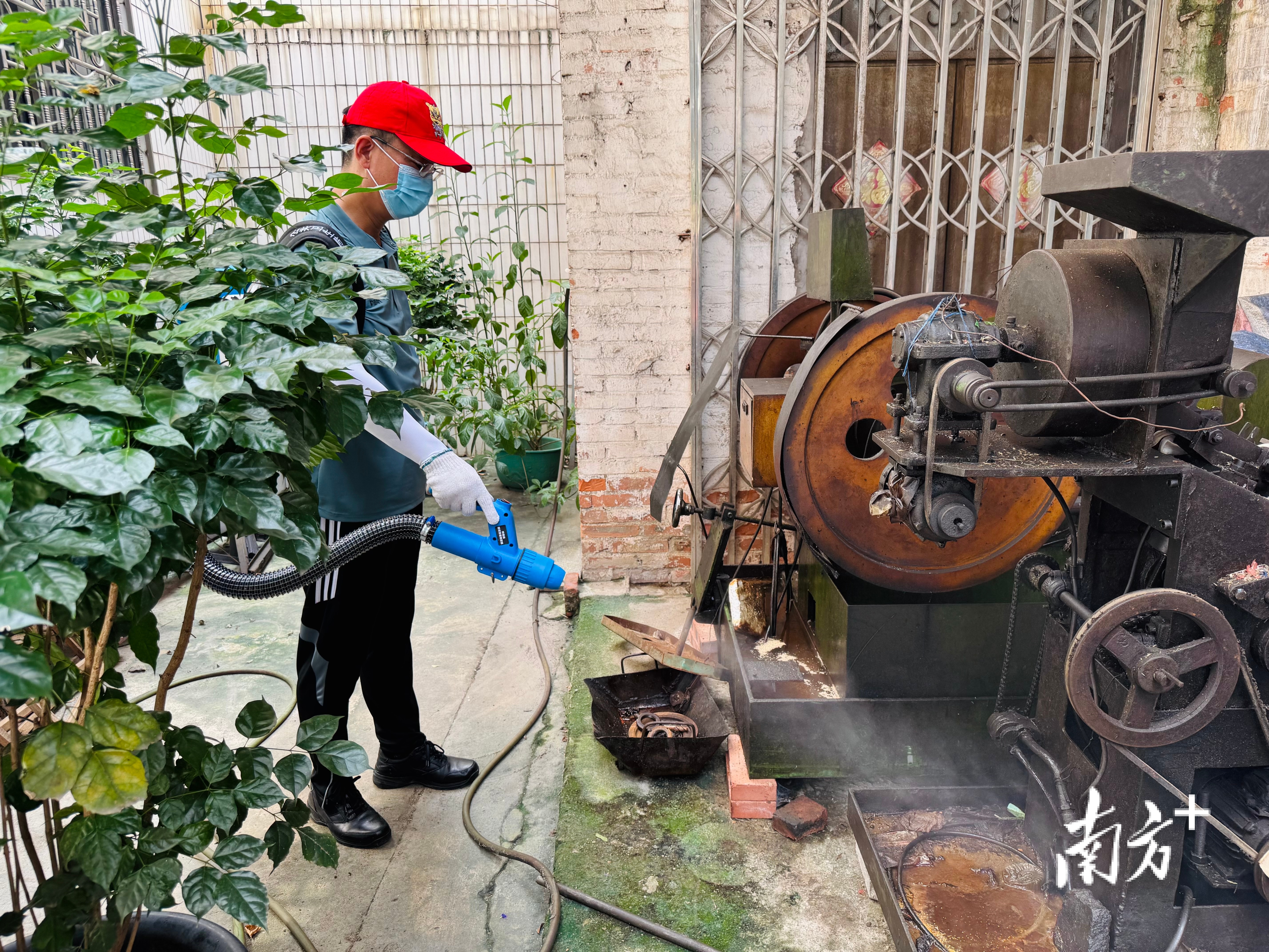 南海区委副书记、区长王勇背上喷雾器深入街巷灭蚊。肖莎莎 摄