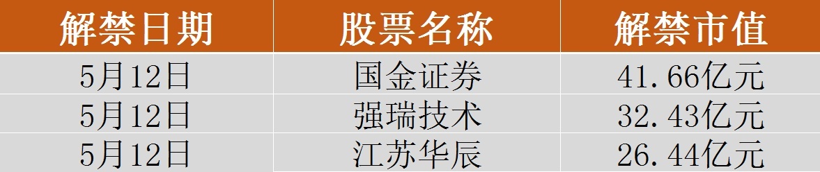具体来看,5月12日,国金证券将解禁5.13亿股,为定向增发机构配售股份;强瑞技术、江苏华辰将分别解禁1.2亿股、0.75亿股,均为首发原股东限售股份。