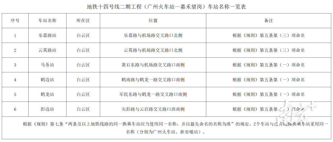 根据广州市交通运输局此前发布的站名意见征集,十四号线二期的8座车站中,2个车站与已有线路换乘车站采用同一名称,分别为广州火车站、新市墟站,6个新命名车站分别拟命名为乐嘉路站、云霄路站、马务站、鹤边站、鹤龙站、彭边站。最终名称仍有待公示。