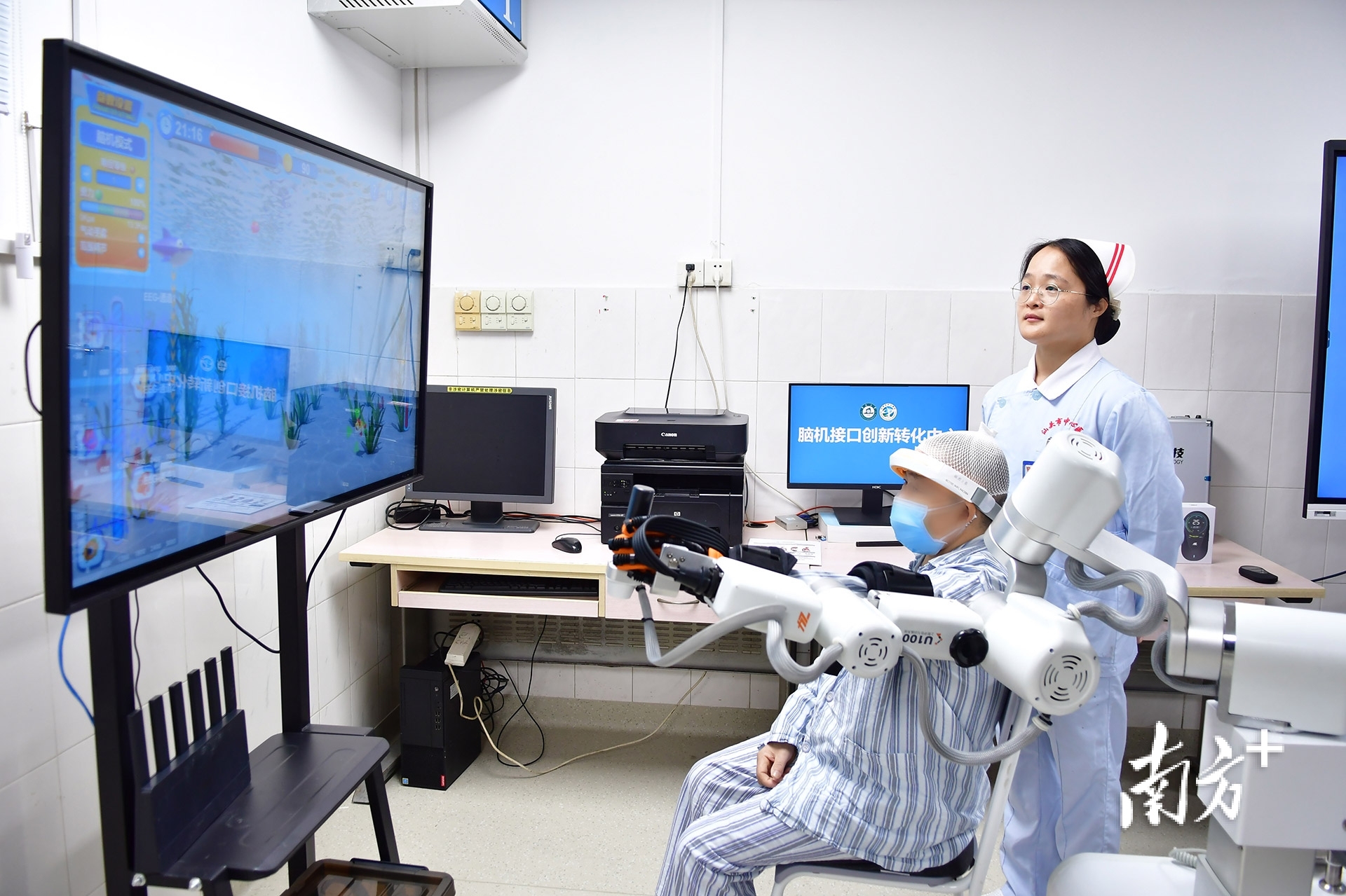 “想象向下移动”“达到运动想象标准”……在脑机接口系统的引领下,一名患者像玩游戏一样体验运动康复 南方+ 彭深 拍摄