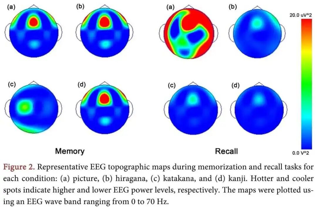 2025年,西九州大学学者松尾萌美等研究人员使用了四种不同类型的记忆任务(图片、平假名、片假名和汉字)来研究记忆任务的表现,以阐明视觉识别差异的影响,并使用脑电图(EEG)来测量了记忆任务期间的大脑活动。结果显示,图片条件表现出最高的EEG活动,其次是汉字、平假名和片假名条件。