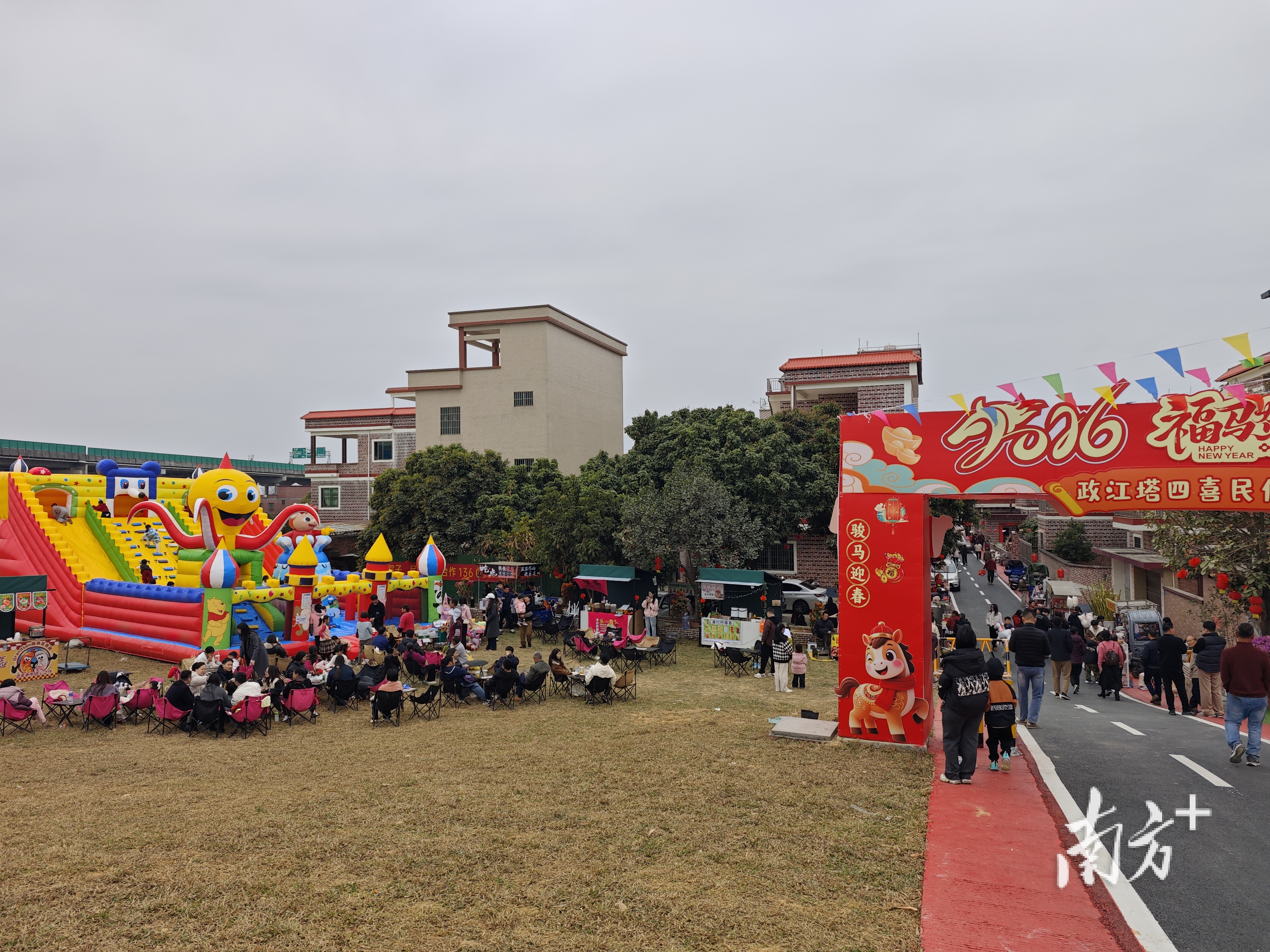 走进政江四喜民俗村,首先映入眼帘的便是巍然屹立的政江塔。这座百年古塔,在“百千万工程”的精心修缮与周边环境提升下,再次焕发出新的生机。塔下原本杂乱的空地,如今已变身开阔的绿美草坪和热闹纷繁的集市,这里不仅是摄影爱好者的天堂,更是近观北江烟波的绝佳观景台。