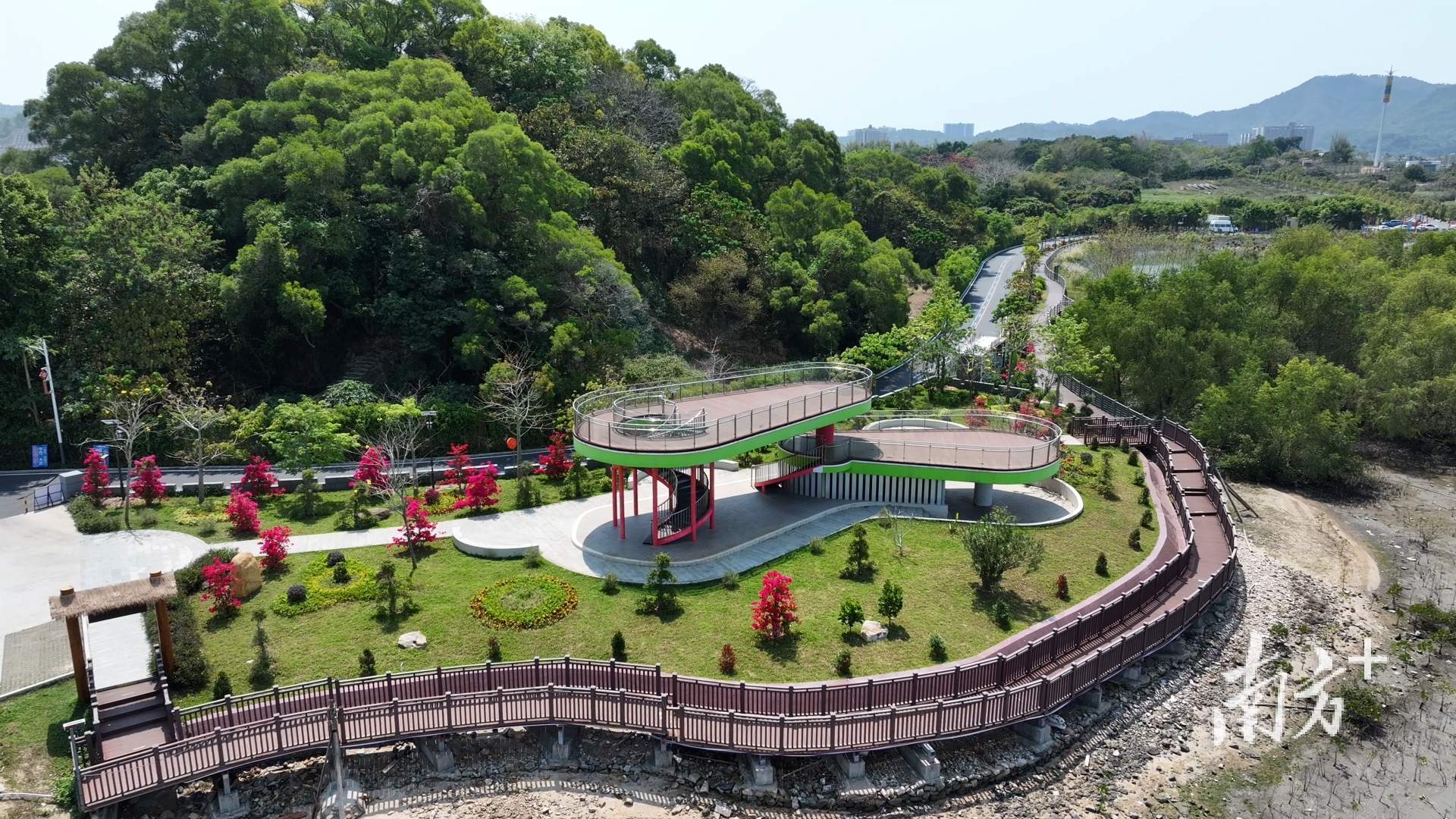 站在观鹭台上,眼前是鹭鸟翩跹的红树林,身后是绿树繁花掩映的村落;远处,被誉为粤东“桥头堡”的长沙湾服务区与这片绿美景观相映成趣。