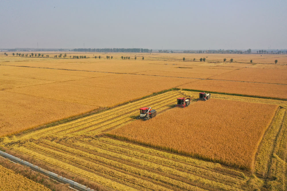 在吉林省公主岭市,吉林省米兜种植农民专业合作社进行机械化收割水稻作业展示(2025年10月14日摄,无人机照片)。新华社记者 张楠 摄