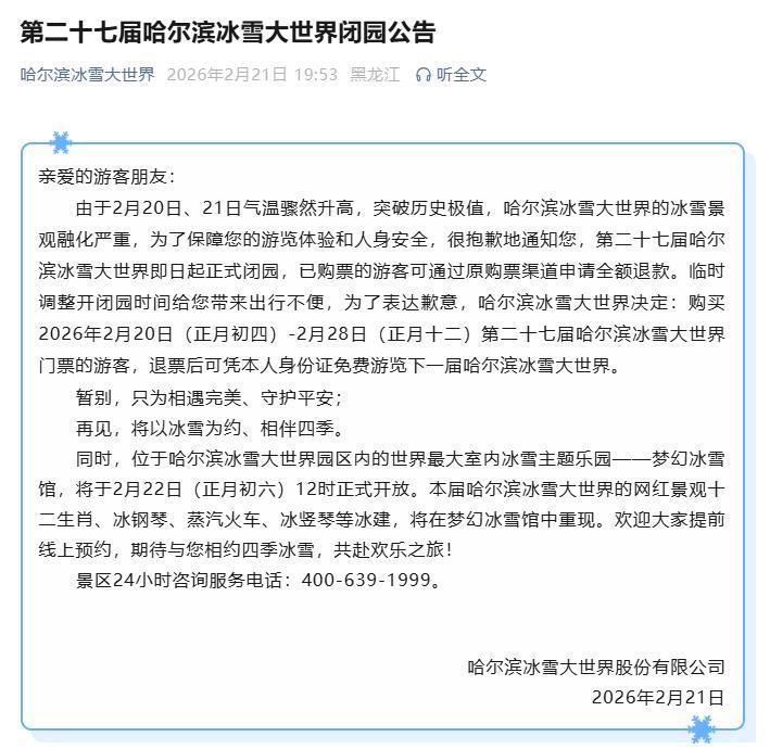 由于2月20日、21日气温骤然升高,突破历史极值,哈尔滨冰雪大世界的冰雪景观融化严重,为了保障您的游览体验和人身安全,很抱歉地通知您,第二十七届哈尔滨冰雪大世界即日起正式闭园,已购票的游客可通过原购票渠道申请全额退款。临时调整开闭园时间给您带来出行不便,为了表达歉意,哈尔滨冰雪大世界决定:购买2026年2月20日(正月初四)-2月28日(正月十二)第二十七届哈尔滨冰雪大世界门票的游客,退票后可凭本人身份证免费游览下一届哈尔滨冰雪大世界。
