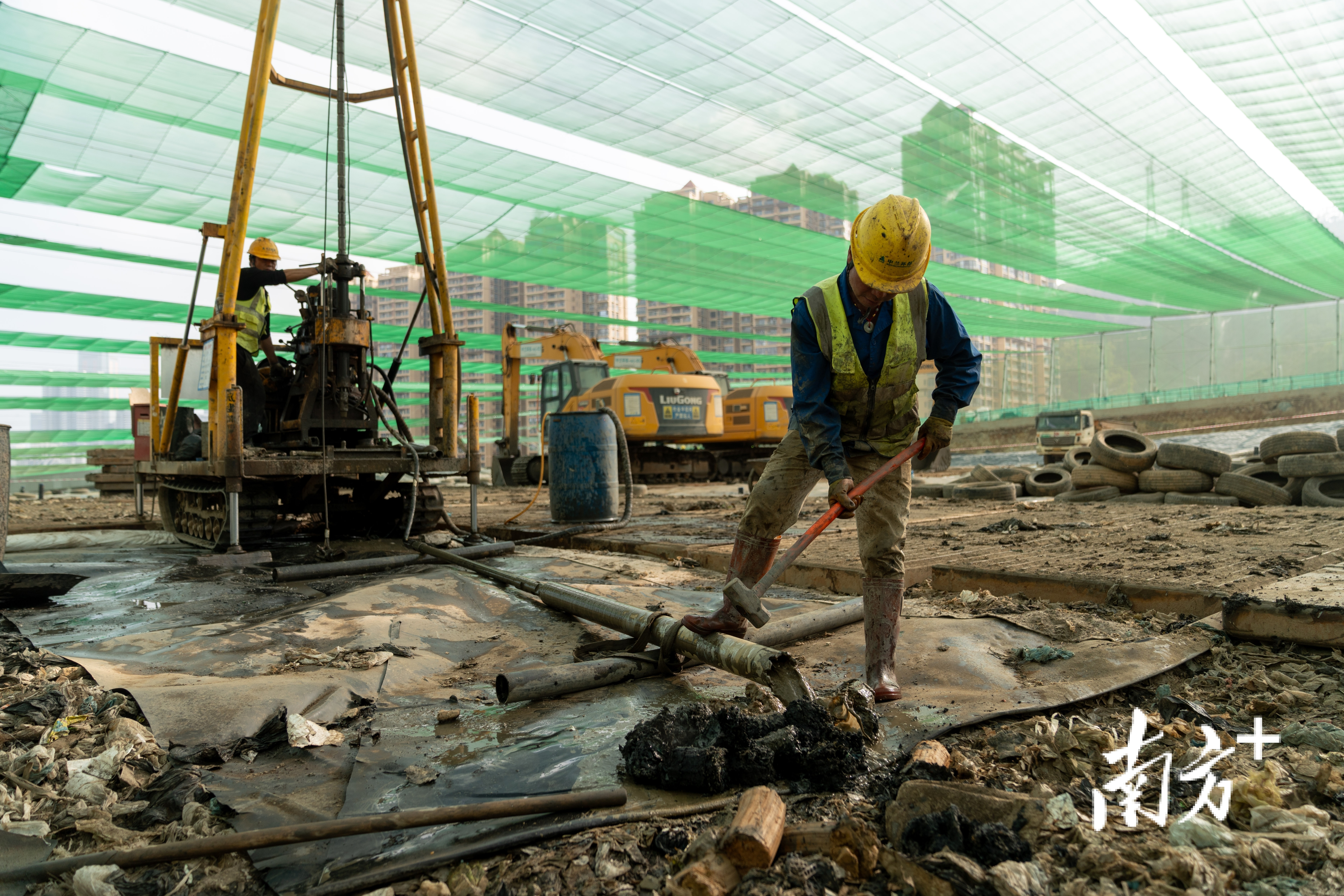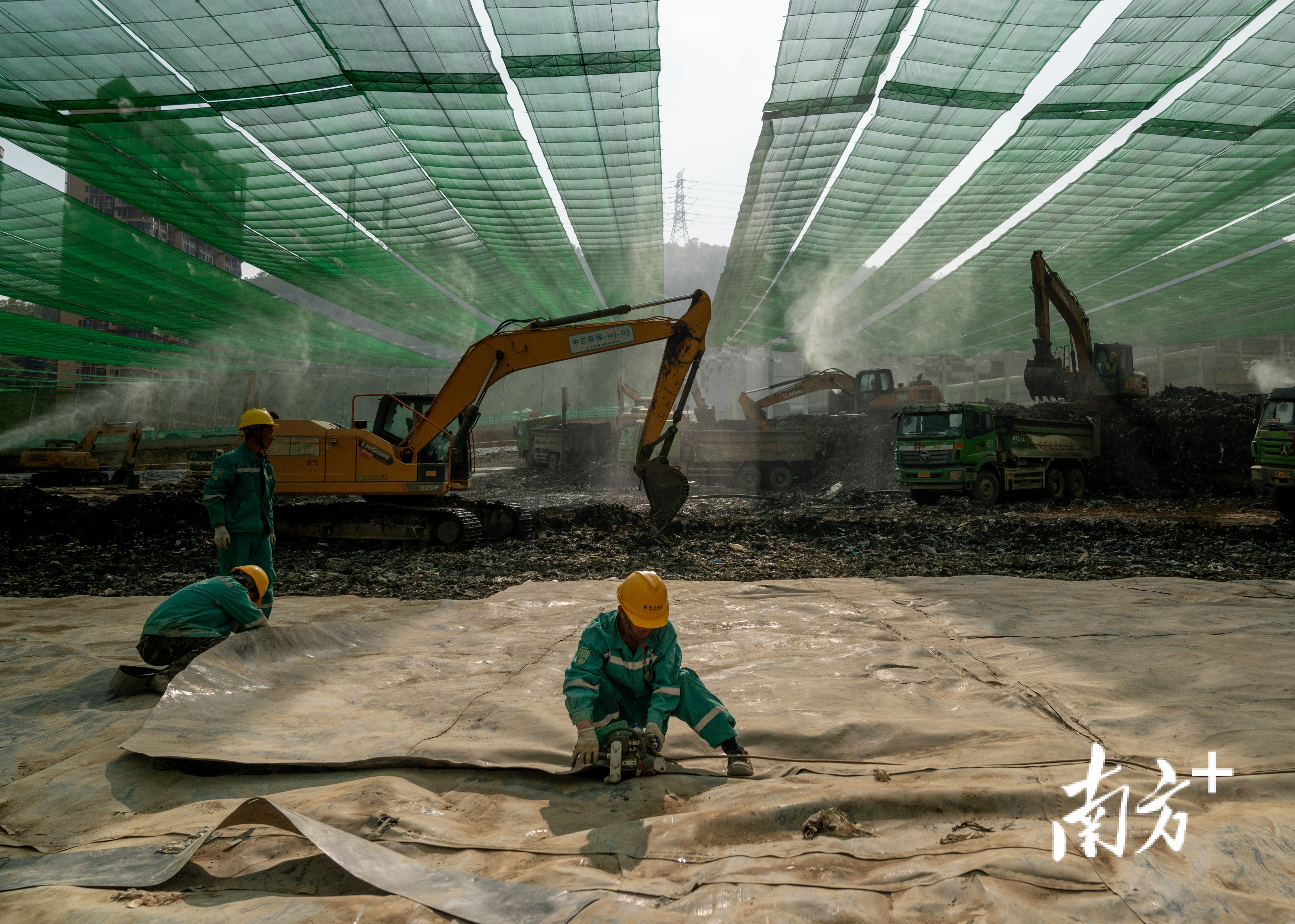 如今,驱车沿山前行,在半山腰上,一座巨大的绿色“天幕”映入眼帘,“天幕”之下,数十个足球场大小的区域被黑色幕布覆盖,一排排挖掘机在半山腰开挖。所挖的,正是在此沉睡超过二十多年、总量超过410万吨的垃圾。
