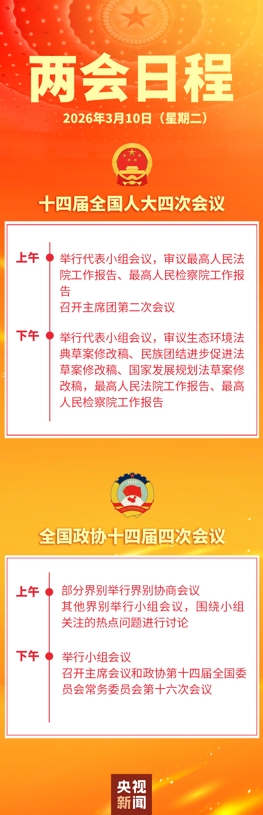 十四届全国人大四次会议10日上午举行代表小组会议,审议最高人民法院工作报告、最高人民检察院工作报告;召开主席团第二次会议。