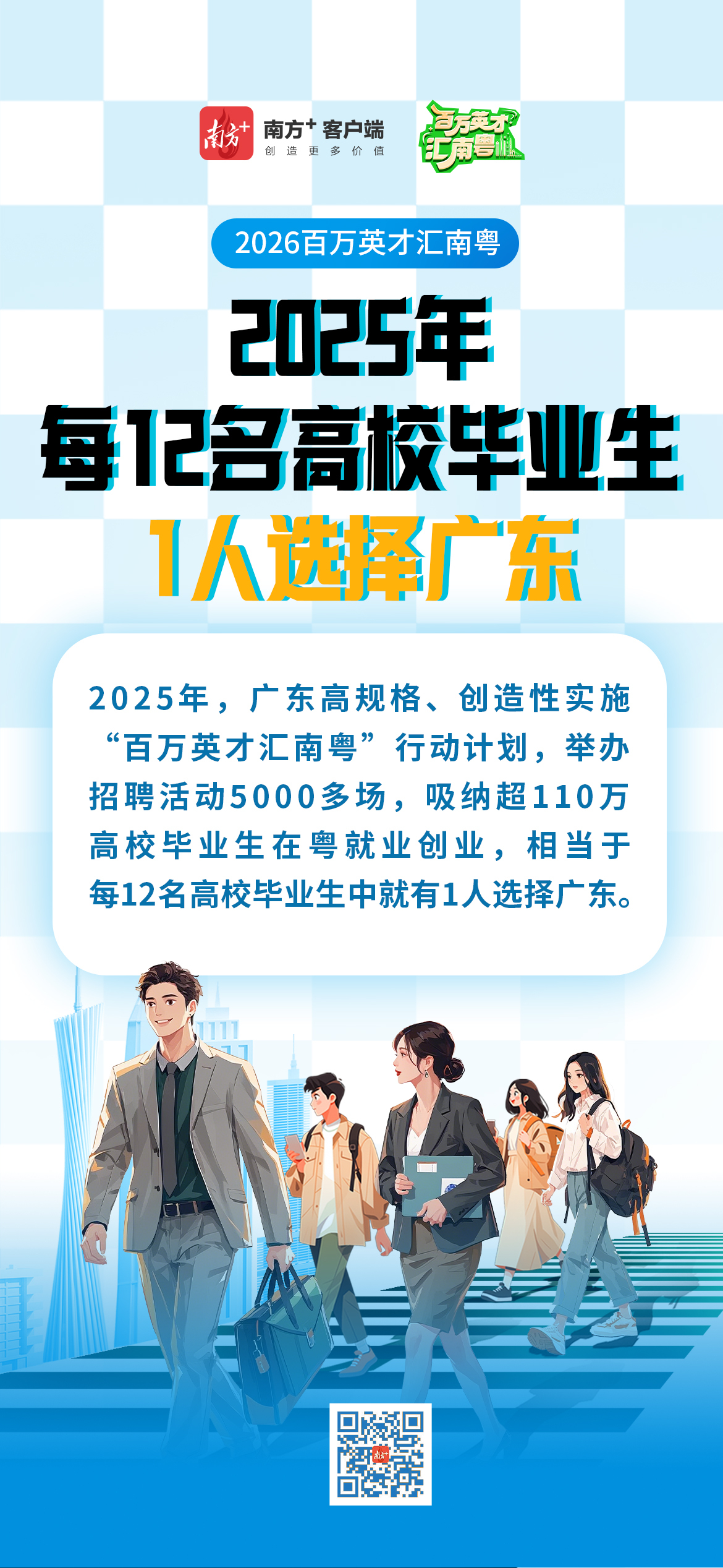 今年,广东继续深入实施“百万英才汇南粤”行动计划,在去年吸纳超110万高校毕业生在粤就业创业的基础上,今年再吸纳100万以上高校毕业生在粤就业创业。
