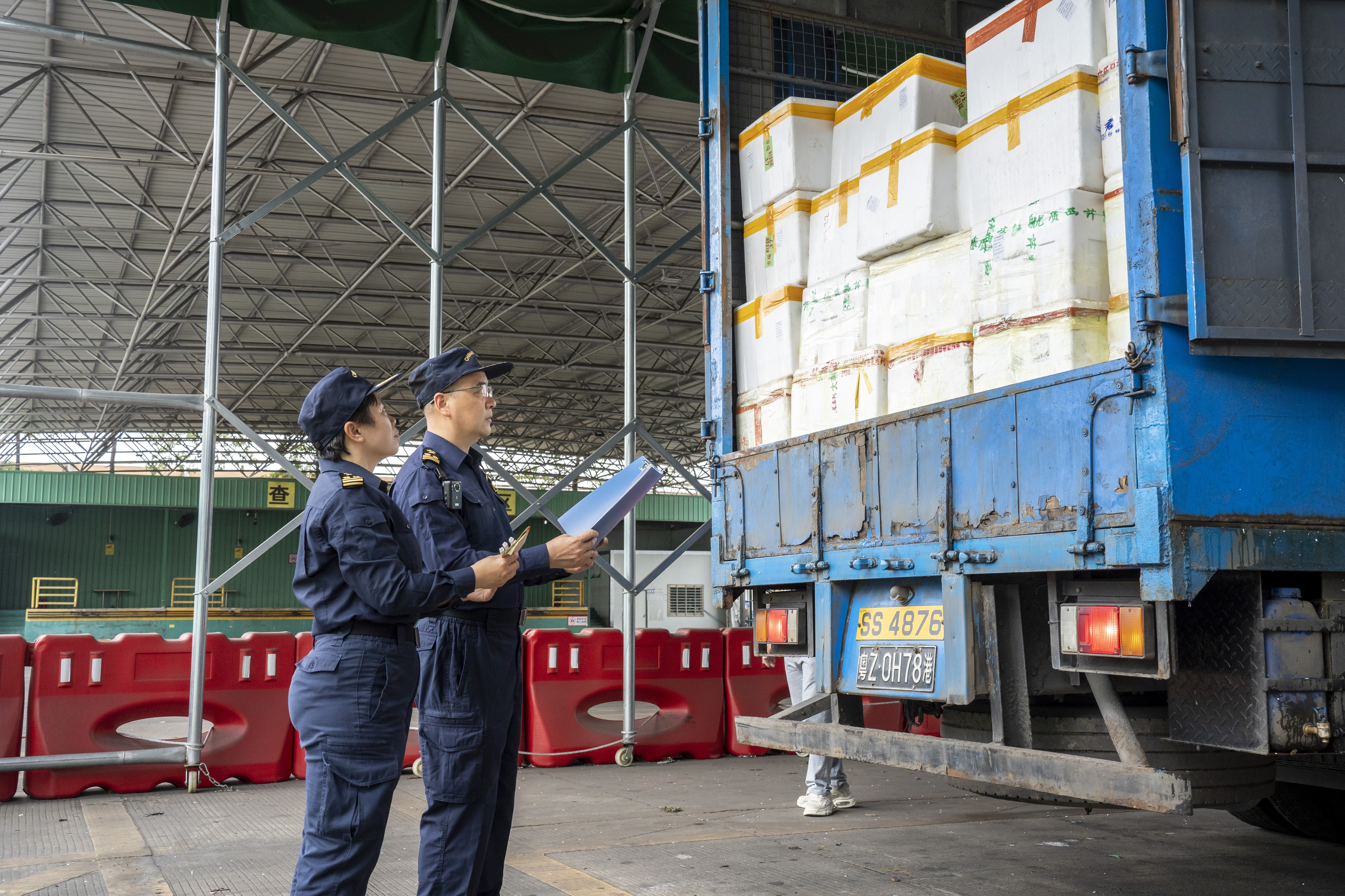 下午1点多,满载着供港蔬菜的车辆陆续进入海关监管中心待海关查验后出发。属地监管科带班科长林伟钟和植检专家李莹到监管中心,根据出货清单对货物进行核查,核查无误后,他们对车辆施加海关铅封,随后车辆驶往深圳文锦渡口岸通关。