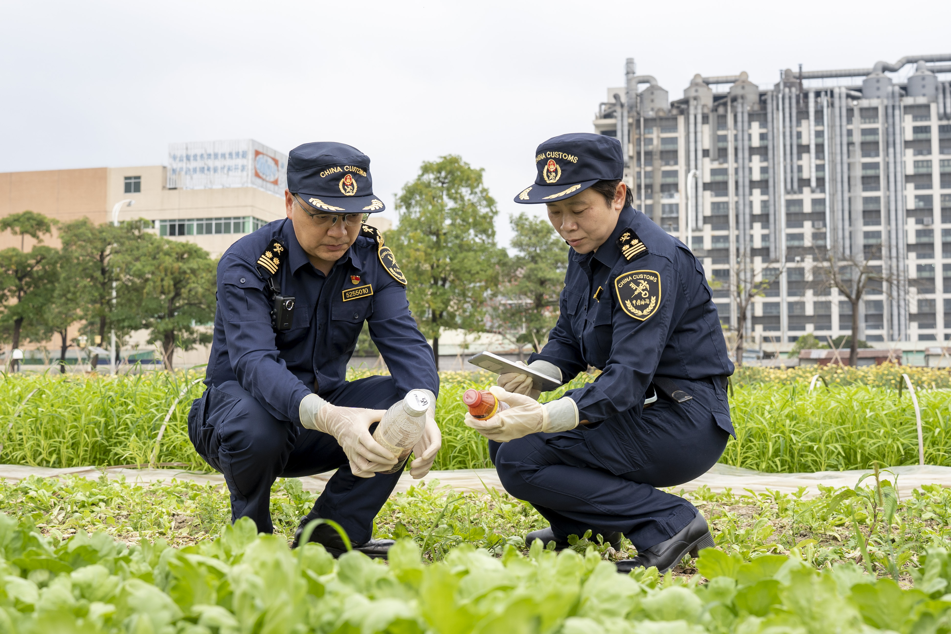 海关工作人员在东莞石碣镇沙腰村的供港蔬菜基地检验供港蔬菜质量。
