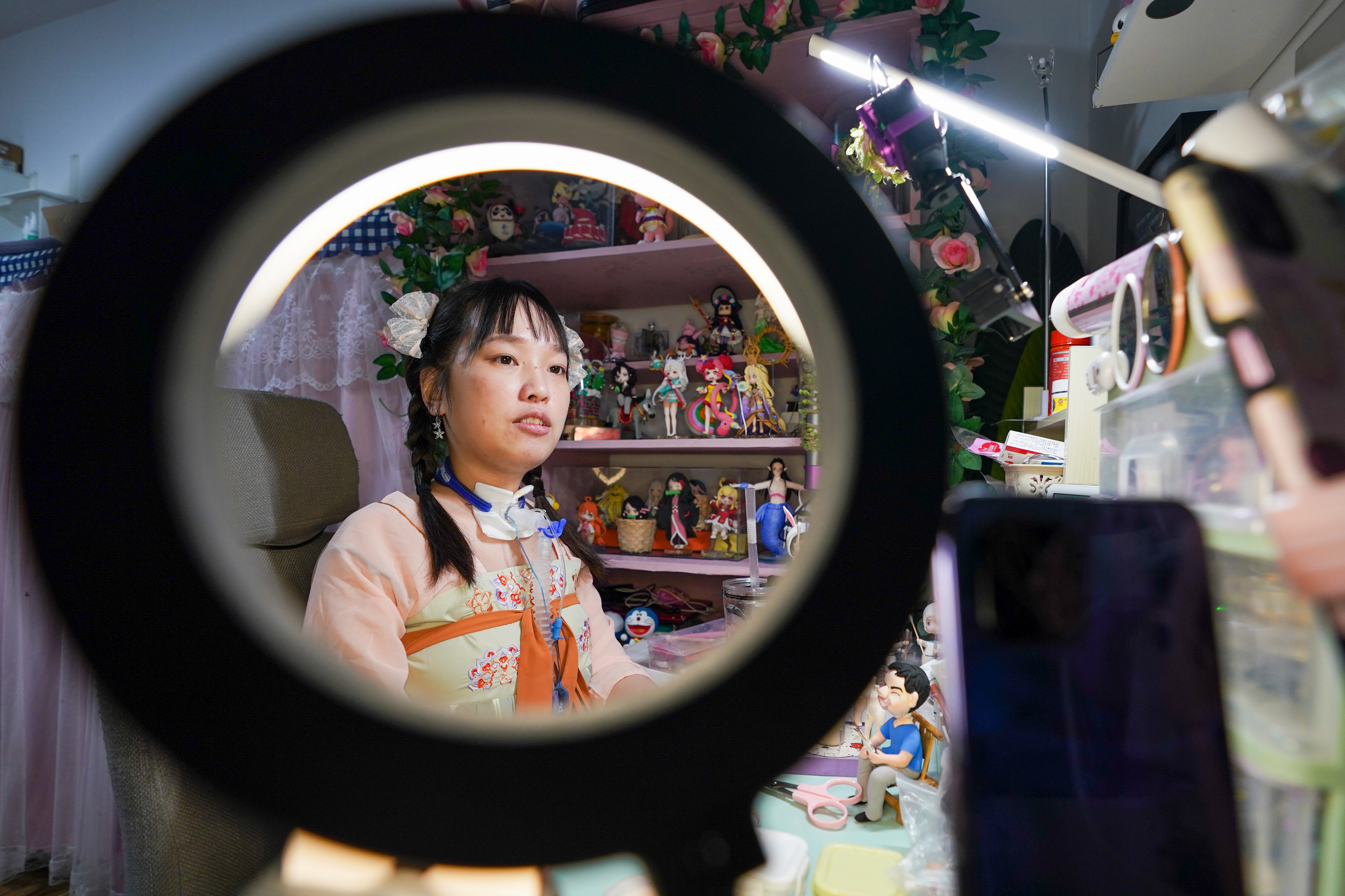 “90后”罕见病女孩在出租屋内进行网络直播。新华社发