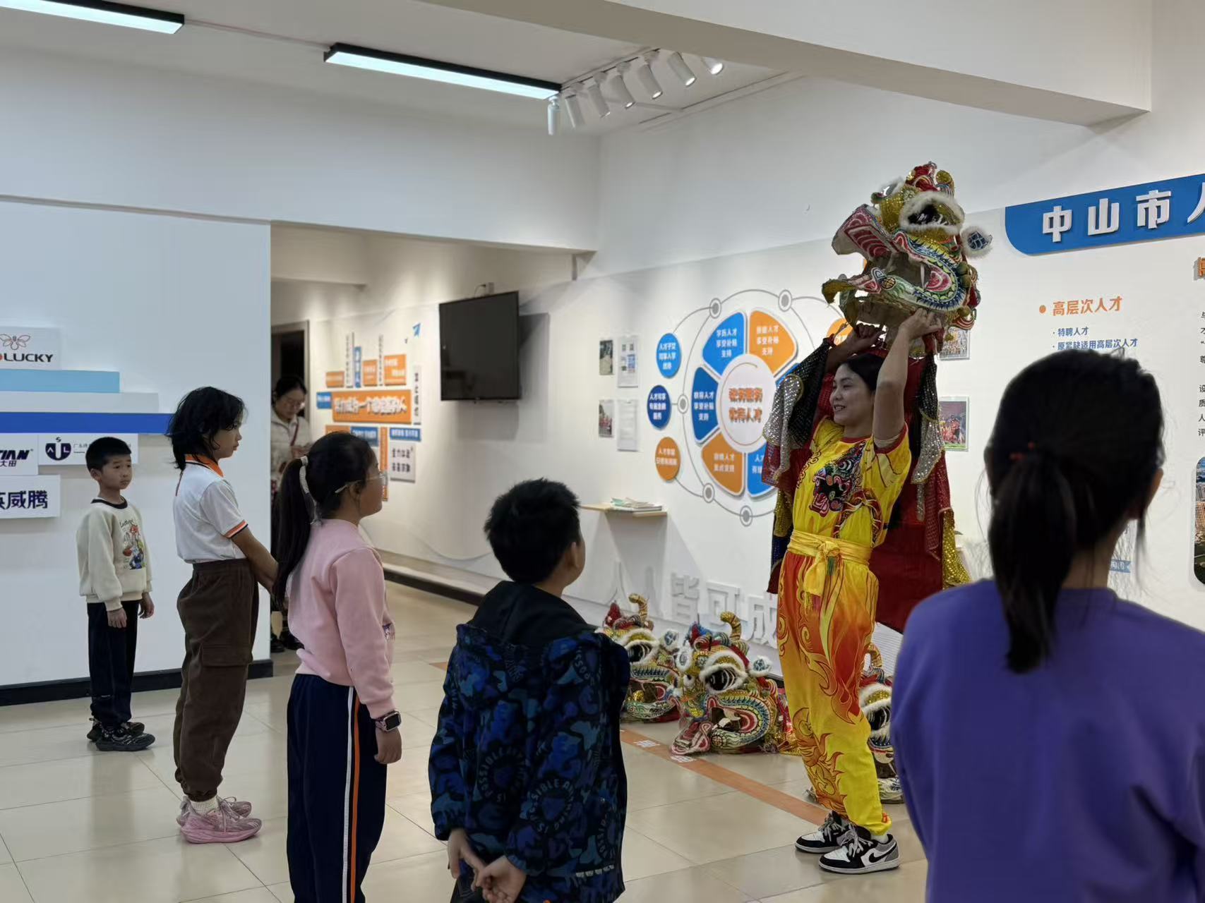 话音刚落,她双手一扬,一个色彩斑斓、栩栩如生的麒麟头便高高举起。“哇!”孩子们不约而同发出惊叹,有的已经跃跃欲试,跟着比划起来。
