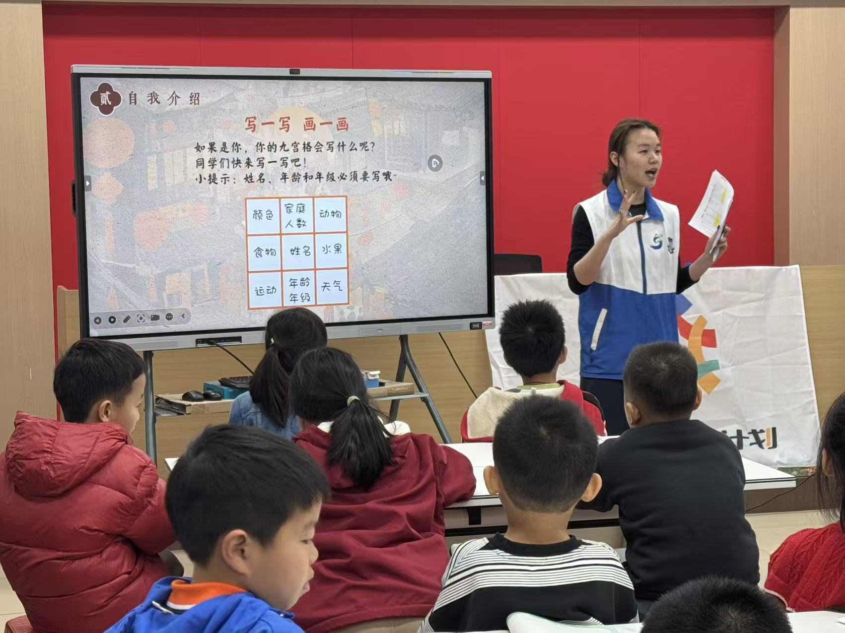 来自华南师范大学“未来教育家”突击队的队员们早有准备。他们给每个孩子发了一张纸,让他们在事先画好的九宫格内写下姓名、爱好、喜欢的食物或颜色等信息。